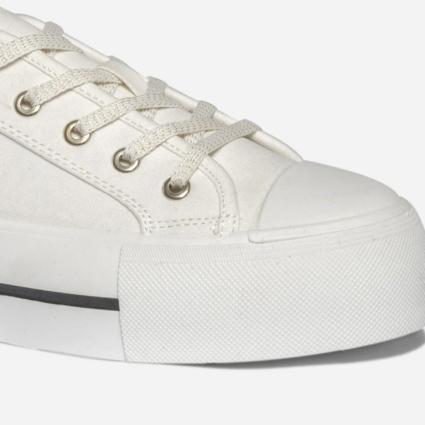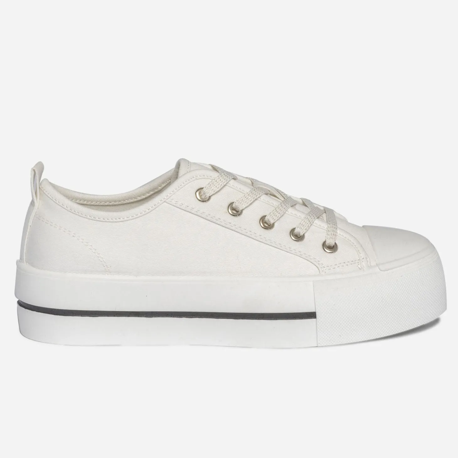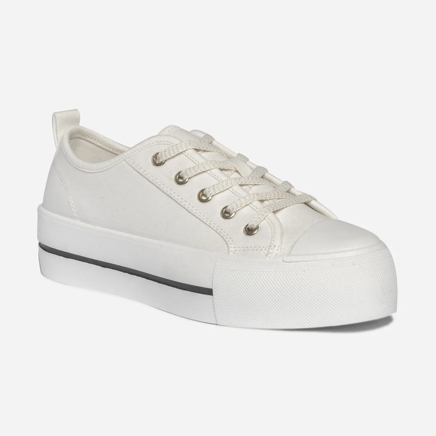 Craquage en vue ! Cette tennis pour femme sort ses plus beaux atouts ! Confectionnée en toile, elle se décline en coloris écru et se ferme par un lacet pailleté. Elle est aussi montée sur une semelle à plateforme de 4 cm, animée d’une fine rayure noire. Un modèle pensé pour la mi-saison, avec des pièces en denim, pour une touche de chic assurée.