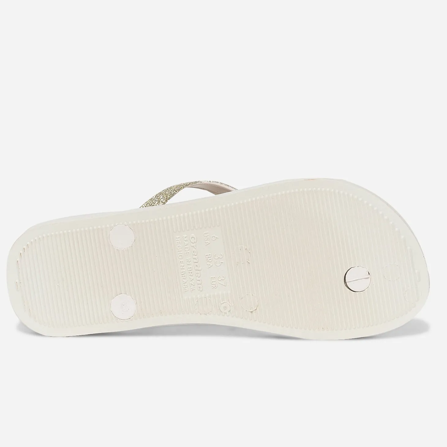 Cette tong pour femme se décline en coloris beige intemporel. Son atout ? Des brides pailletées dorées. La semelle se démarque par un motif graphique, qui fait écho à celui du remblai de la plage d’Ipanema. Un modèle parfait pour un twist fun et chic, avec toutes les tenues d’été.