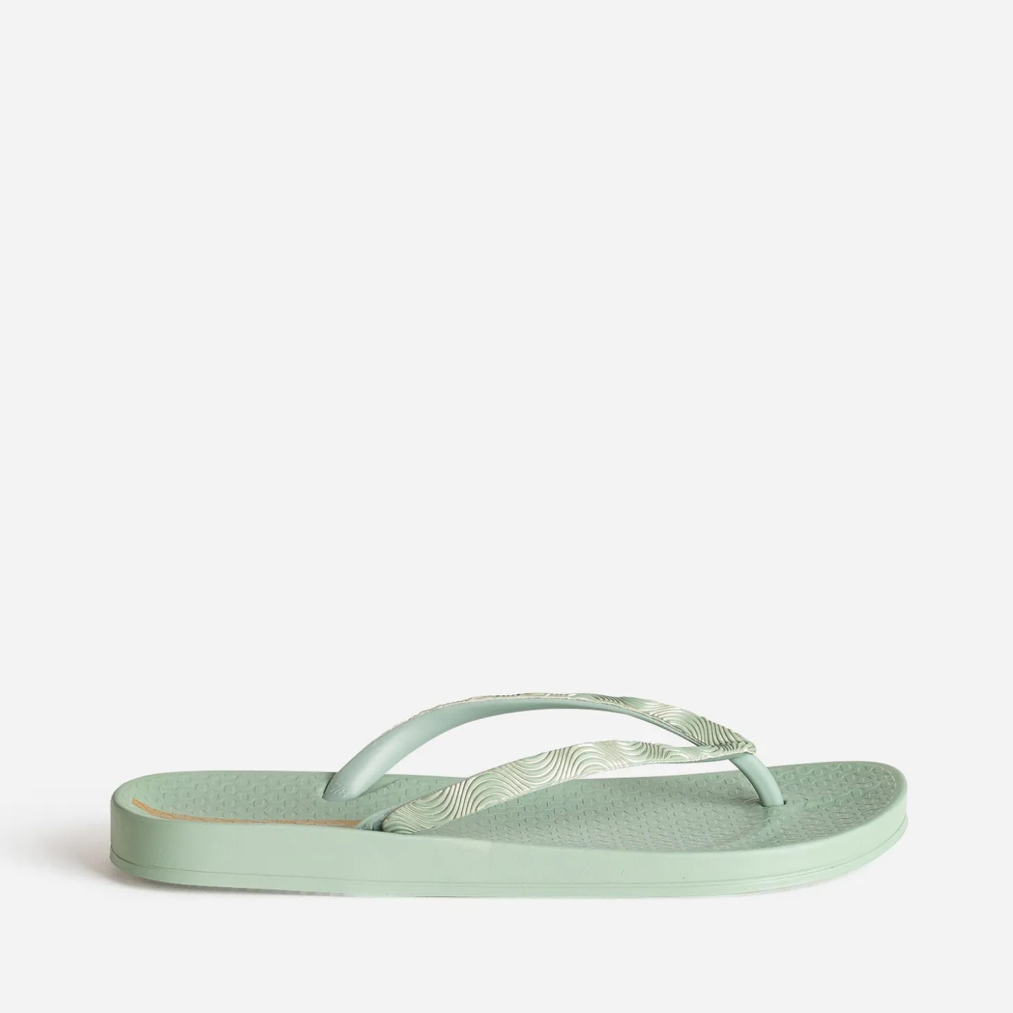 Priorité au confort cet été, avec cette tong pour femme. Son secret ? Une conception en plastique souple recyclé et une semelle qui soulage la plante du pied. Déclinée en coloris vert d’eau, elle présente deux brides avec décor graphique métallisé. Un modèle pour accompagner vos journées ensoleillées en maillot de bain comme vos soirées estivales en robe longue.