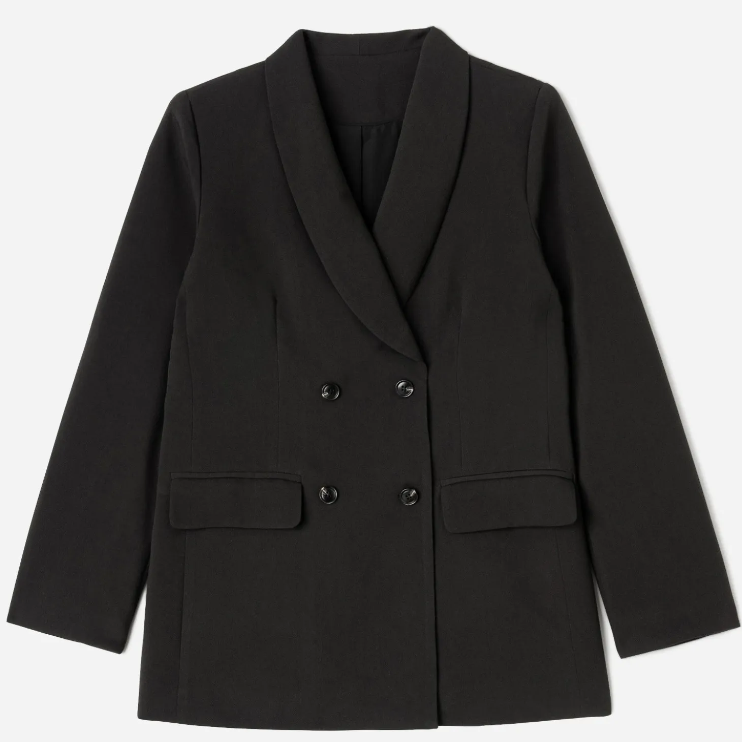 Empruntée au vestiaire masculin, la veste de costume noire est devenue une pièce intemporelle. Col châle, poches passepoilées, elle se ferme par un double boutonnage croisé. Idéal sur un pantalon noir, large ou cigarette, décalée avec une paire de baskets.