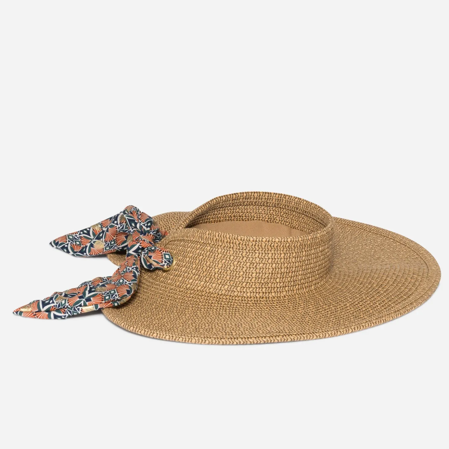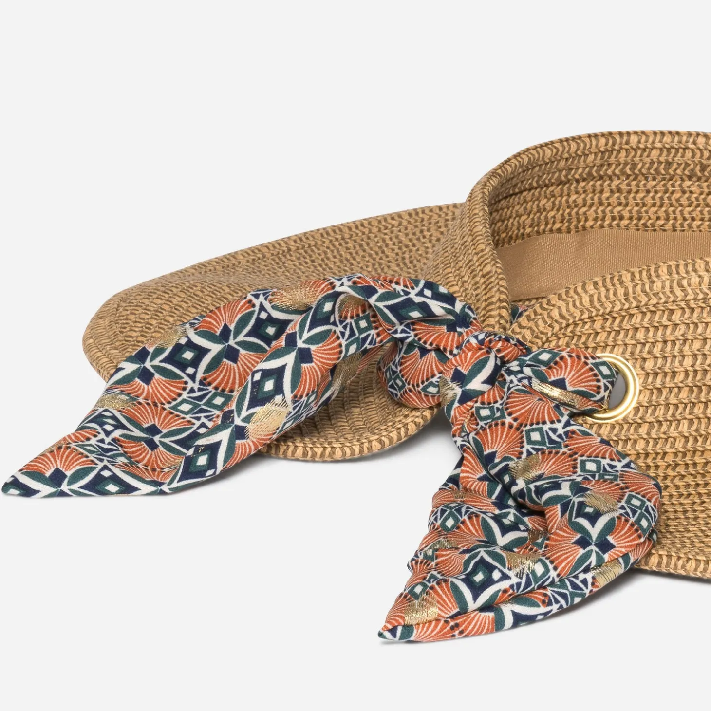 Ce chapeau femme n’est pas un chapeau comme les autres. Formé d’une large visière en paille beige clair et beige foncé, il se ferme à l’arrière, grâce à un ruban coloré, à imprimé Art Déco et maxi pois dorés, glissé dans deux maxi œillets. Un modèle plus esthétique que protecteur, facilement adaptable à tous les tours de tête.