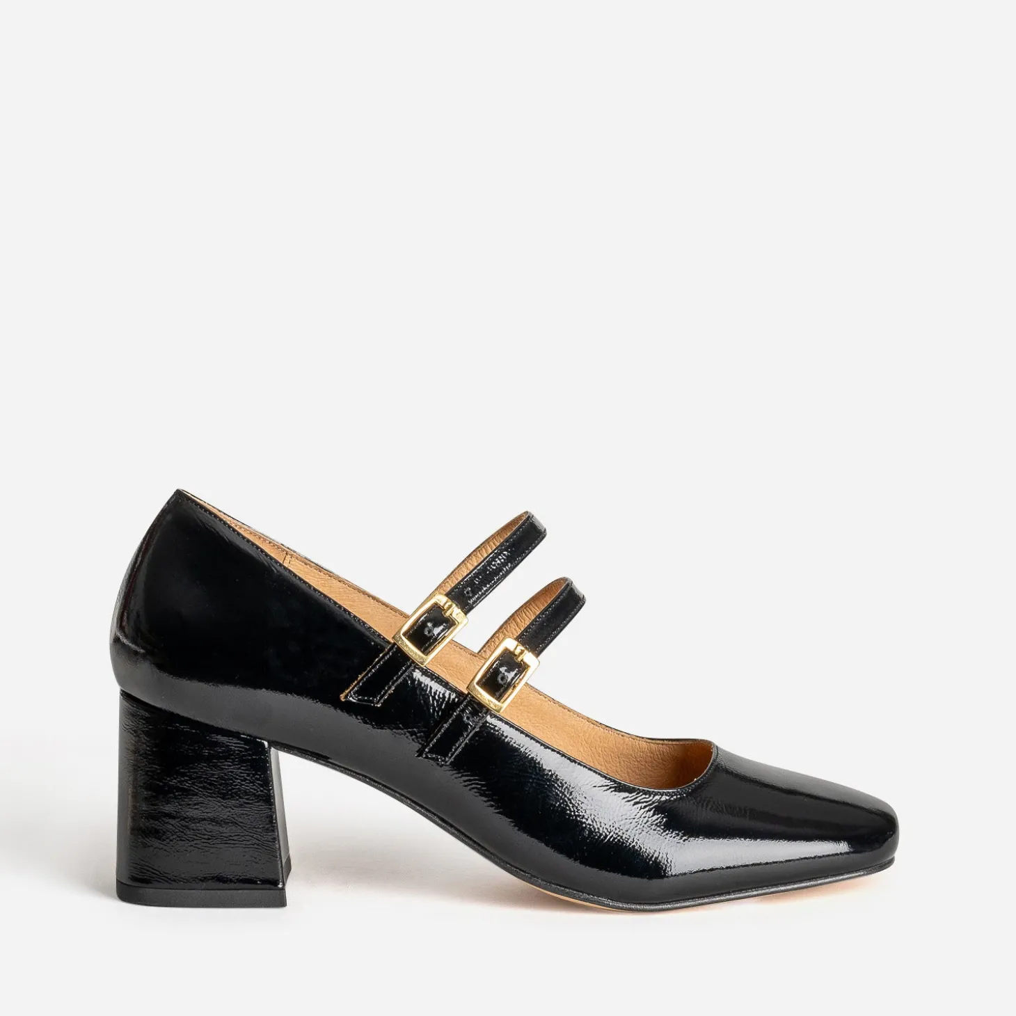 La mode, un éternel recommencement qui se confirme par le retour en force de la babies. Confectionnée en cuir noir, elle s’autorise une finition vernie jusqu’à la pointe de son talon carré, légèrement flare. Le pied est maintenu par deux fines brides parallèles, fermées par des boucles. Un modèle idéal, pour twister une blouse et un jean cropped, dans un esprit rétro.