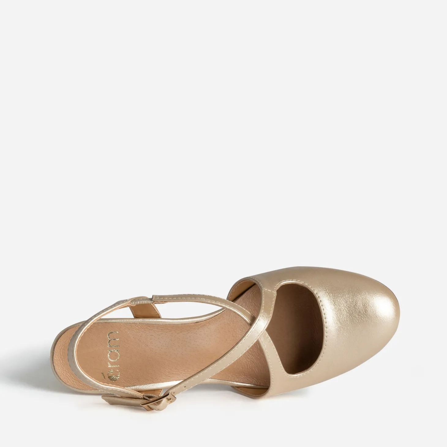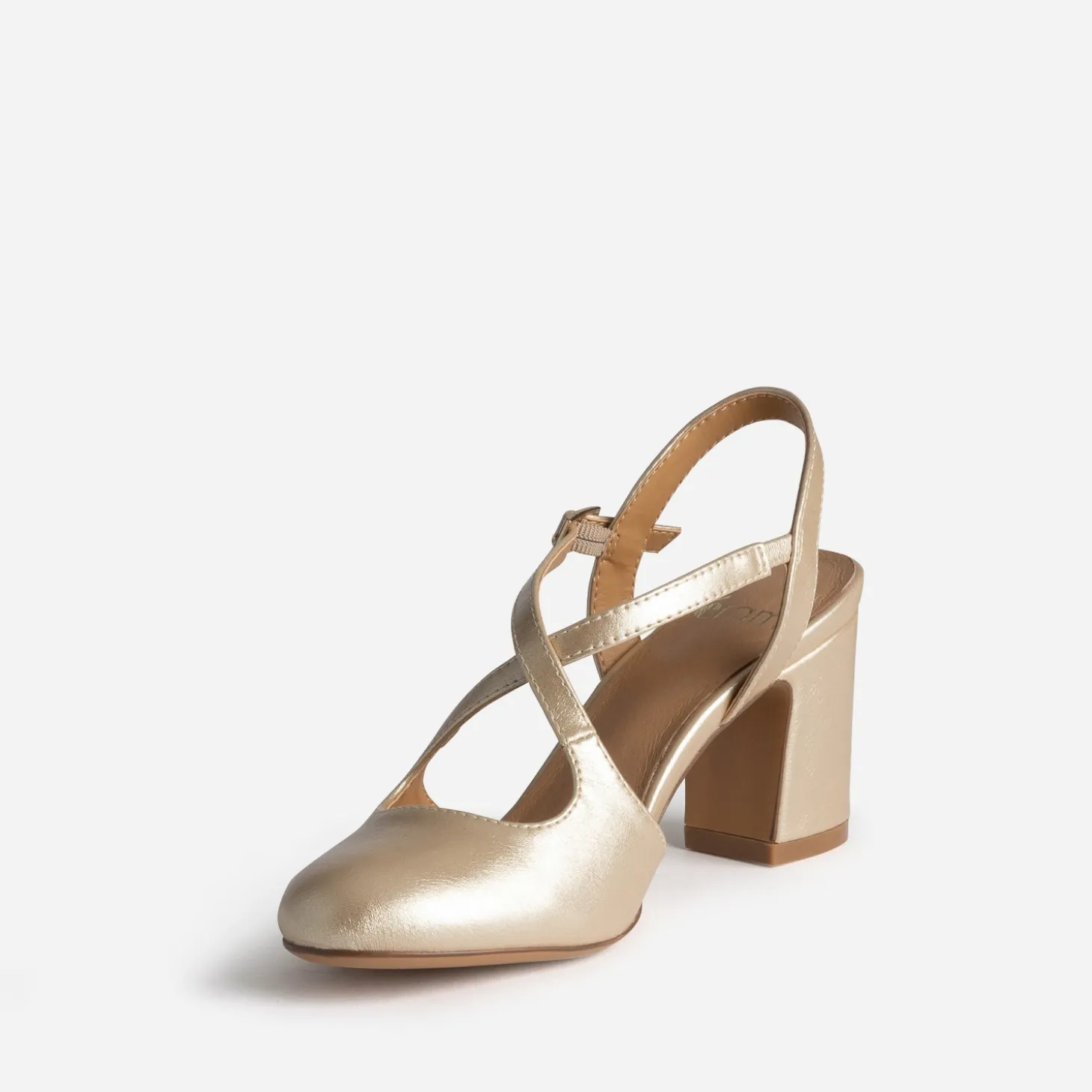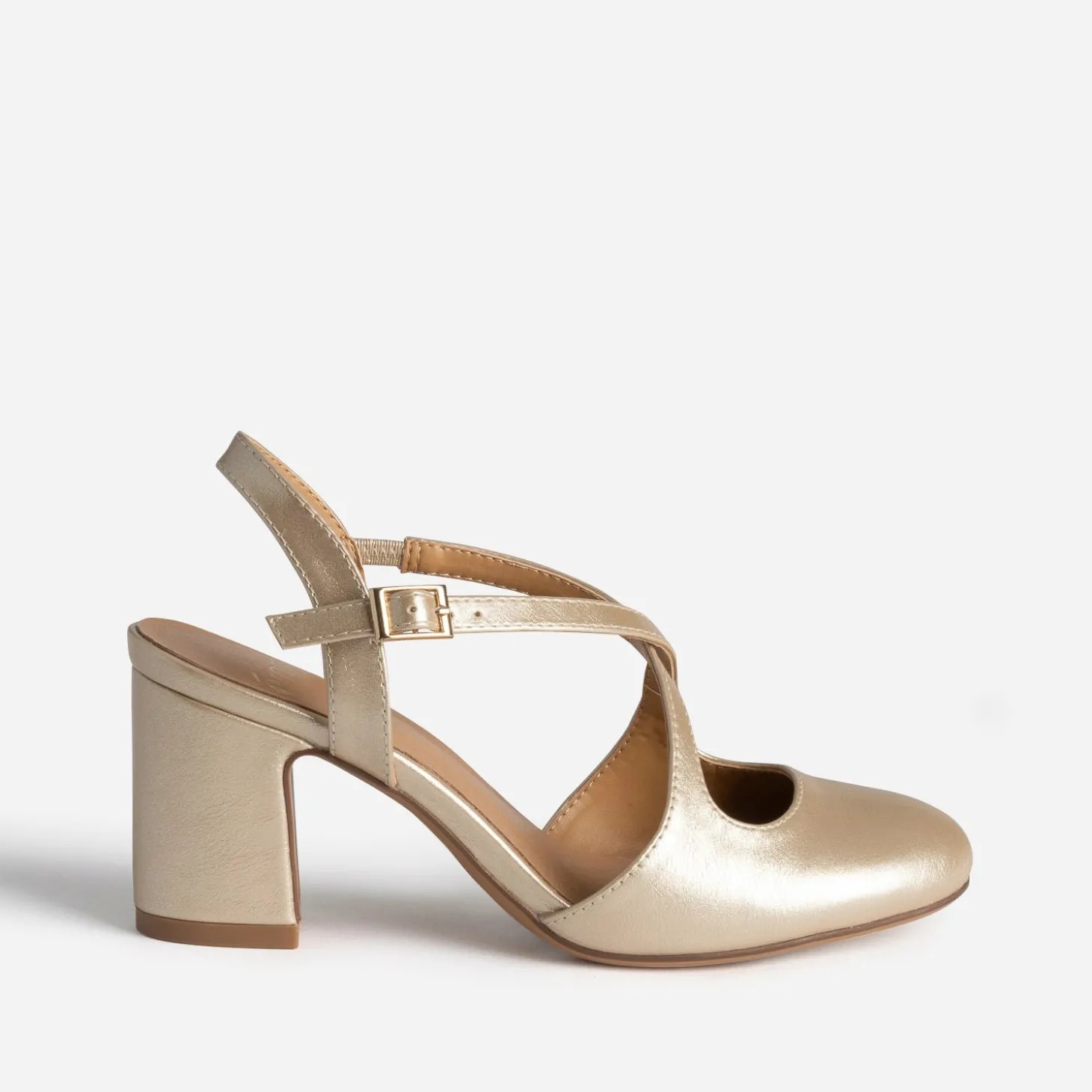Envie de talon tout en ayant le pied parfaitement maintenu ? Optez pour la babies, dotées de brides, ici croisées, sur le dessus du pied. Sa ligne d’inspiration rétro est confortée par un talon carré de 7 cm, et une semelle première moussée très confortable. Son coloris doré s’invite, sans modération, dans les tenues de cérémonie d’été.
