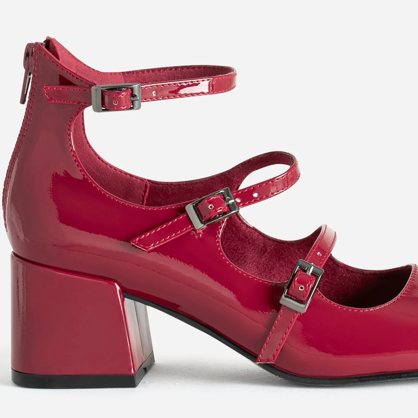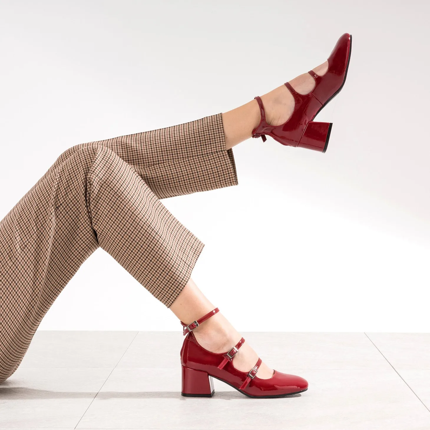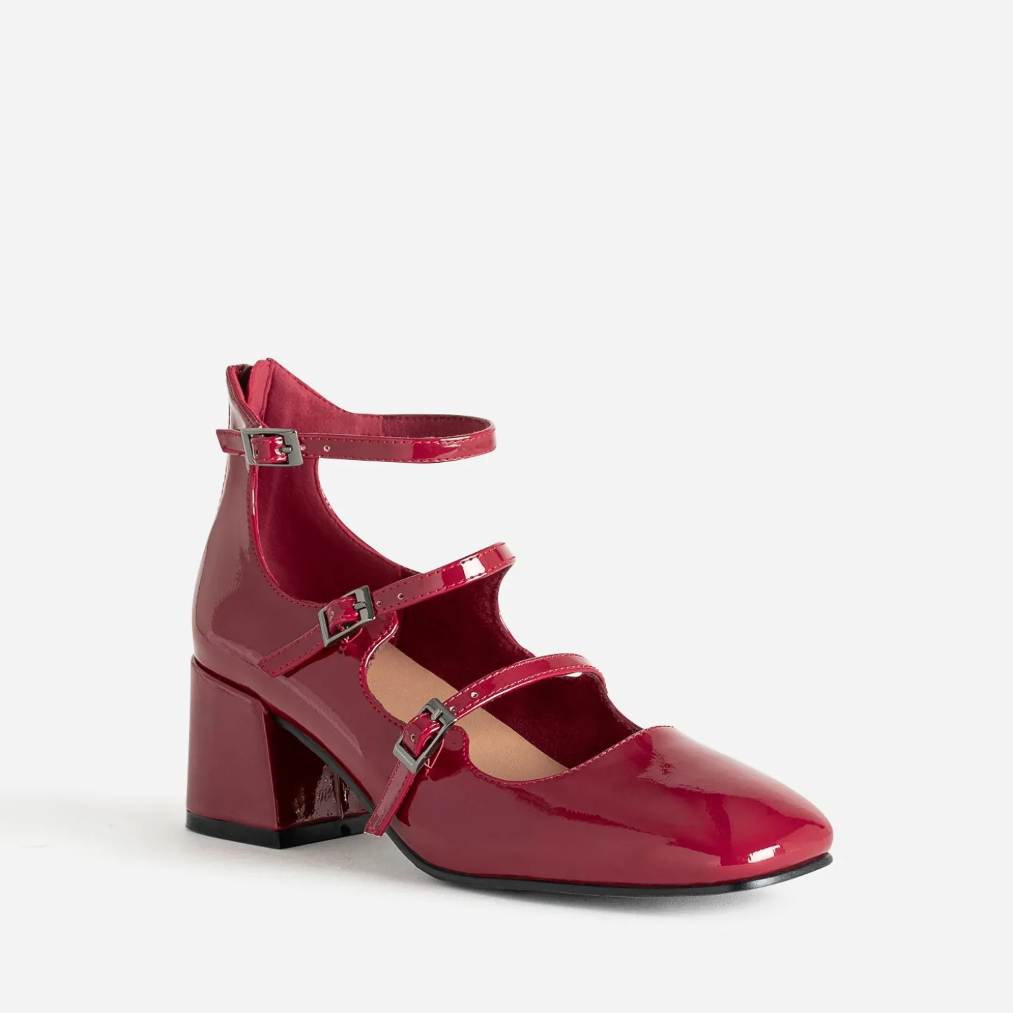 1, 2, 3… brides ! Quand la babies prend de la hauteur, rien de l’arrête ! En matière synthétique rouge, elle ose un bout carré et une finition vernie jusqu’au bout de son talon flare. Le zip, placé à l’arrière de la tige, est un gain de temps indiscutable. Le style rétro n’a pas dit son dernier mot : chemise blanche, costume-jupe trapèze et chaussettes blanches.