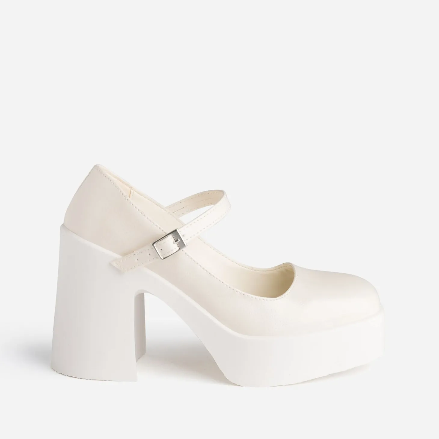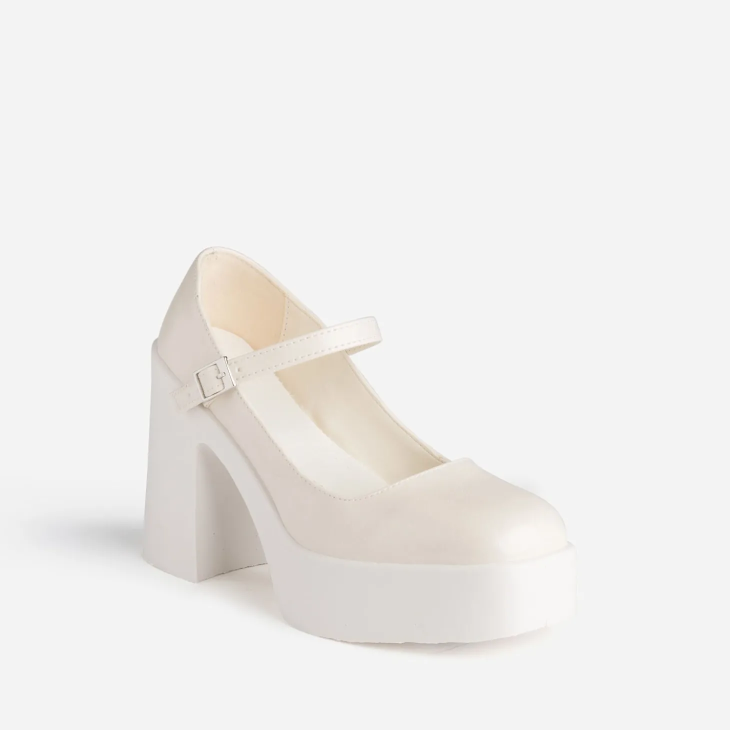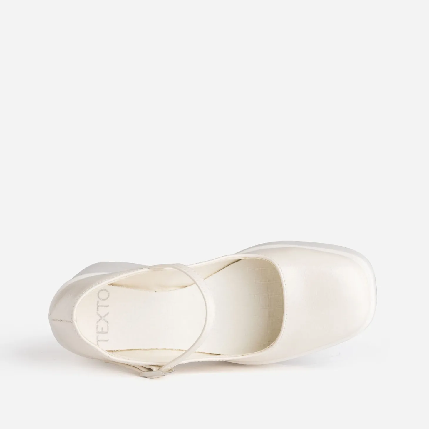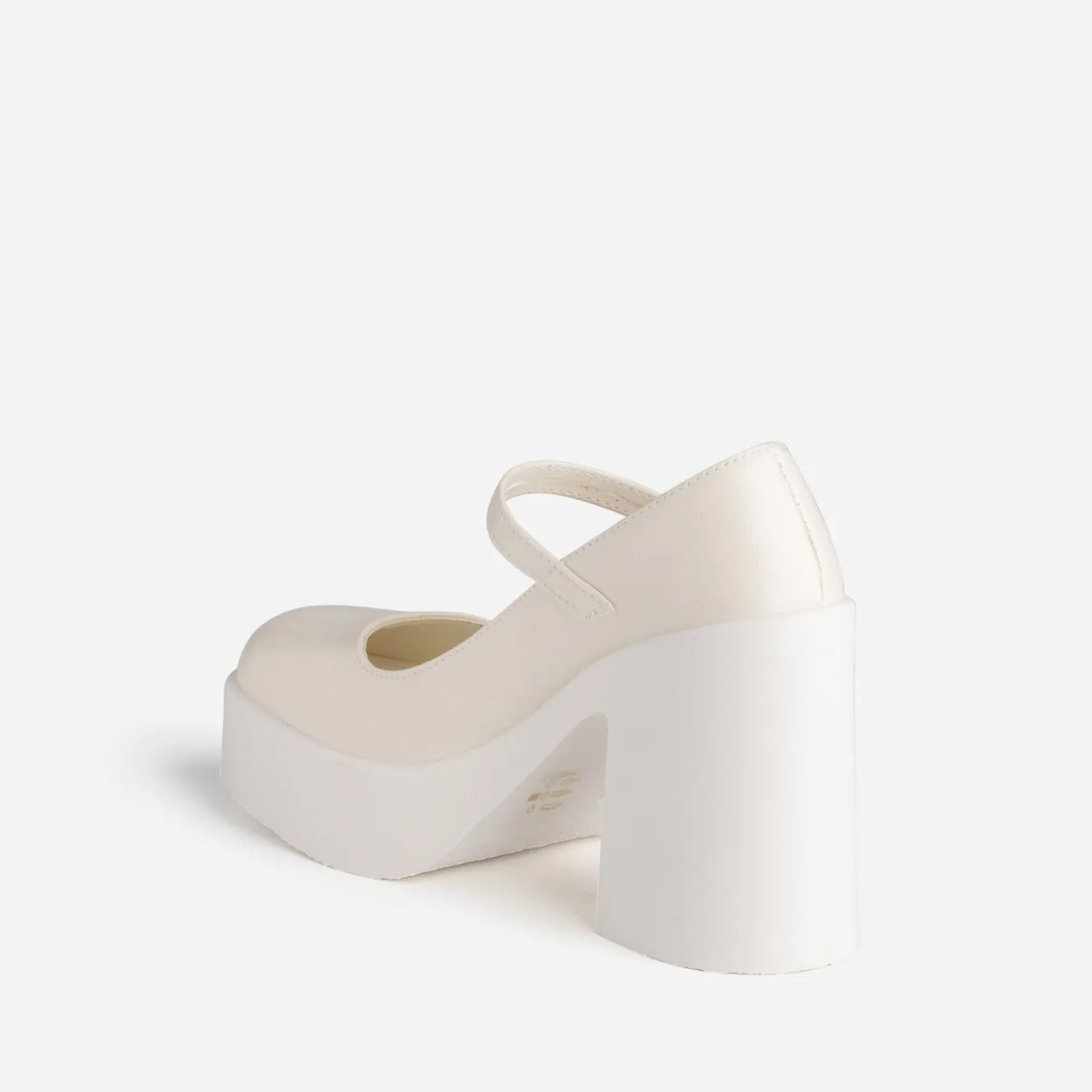 La tendance est au style rétro. La tendance est à la semelle épaisse. La tendance est aux couleurs naturelles. Cette babies pour femme coche toutes les cases, pour vous séduire. En matière synthétique écrue, elle se démarque par une finition vernie et se ferme par une fine bride à boucle. elle est montée sur une semelle blanche à plateforme, 10,5 cm à l’arrière et 3 cm sur le patin avant. Privilégiez-la, dès l’arrivée du printemps.