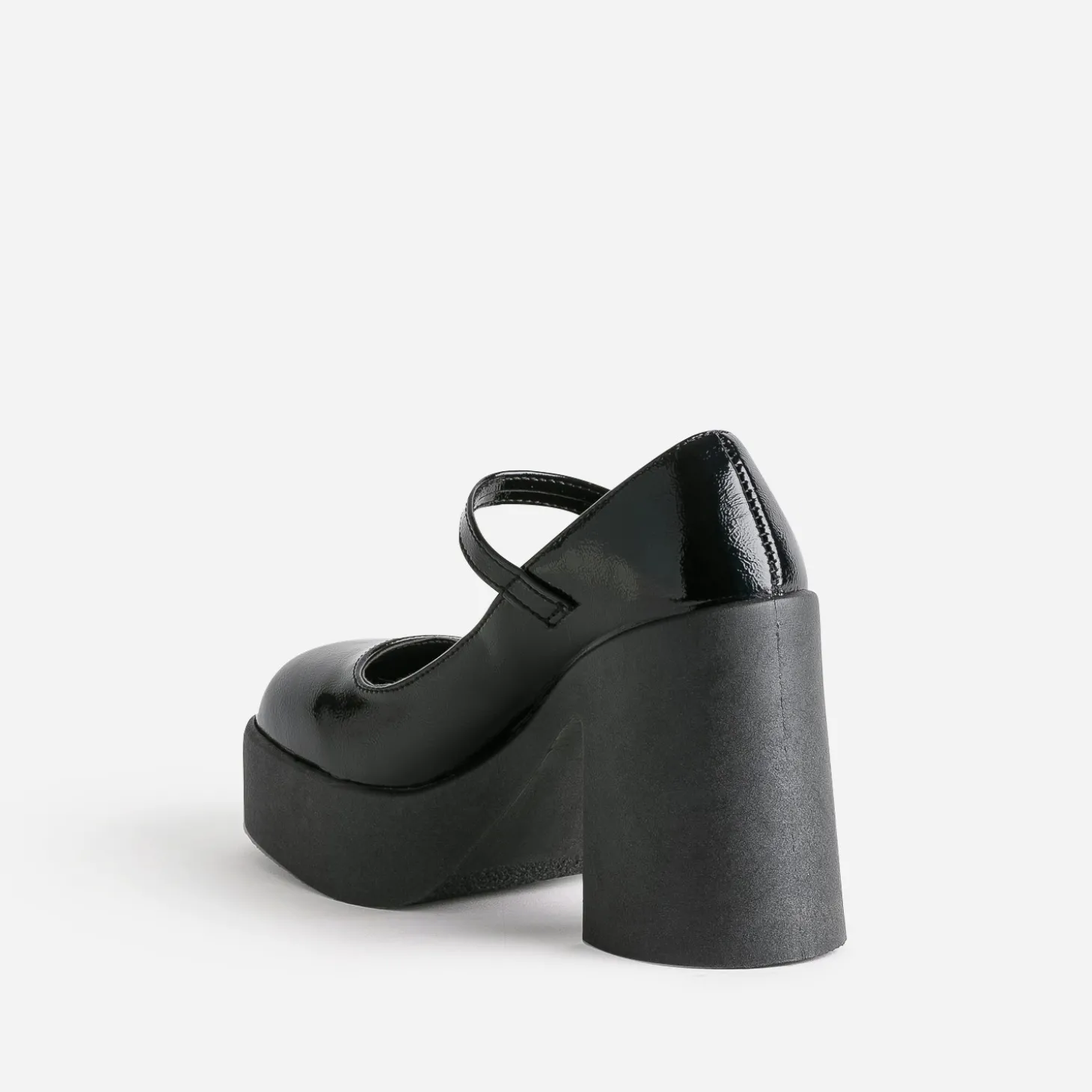 La tendance est au style rétro. La tendance est à la semelle épaisse. La tendance est aux couleurs sobres. Cette babies pour femme coche toutes les cases, pour vous séduire. En matière synthétique noire, elle se démarque par une finition vernie et se ferme par une fine bride à boucle. elle est montée sur une semelle ton sur ton à plateforme, 10,5 cm à l’arrière et 3 cm sur le patin avant. Privilégiez-la, dès l’arrivée du printemps.