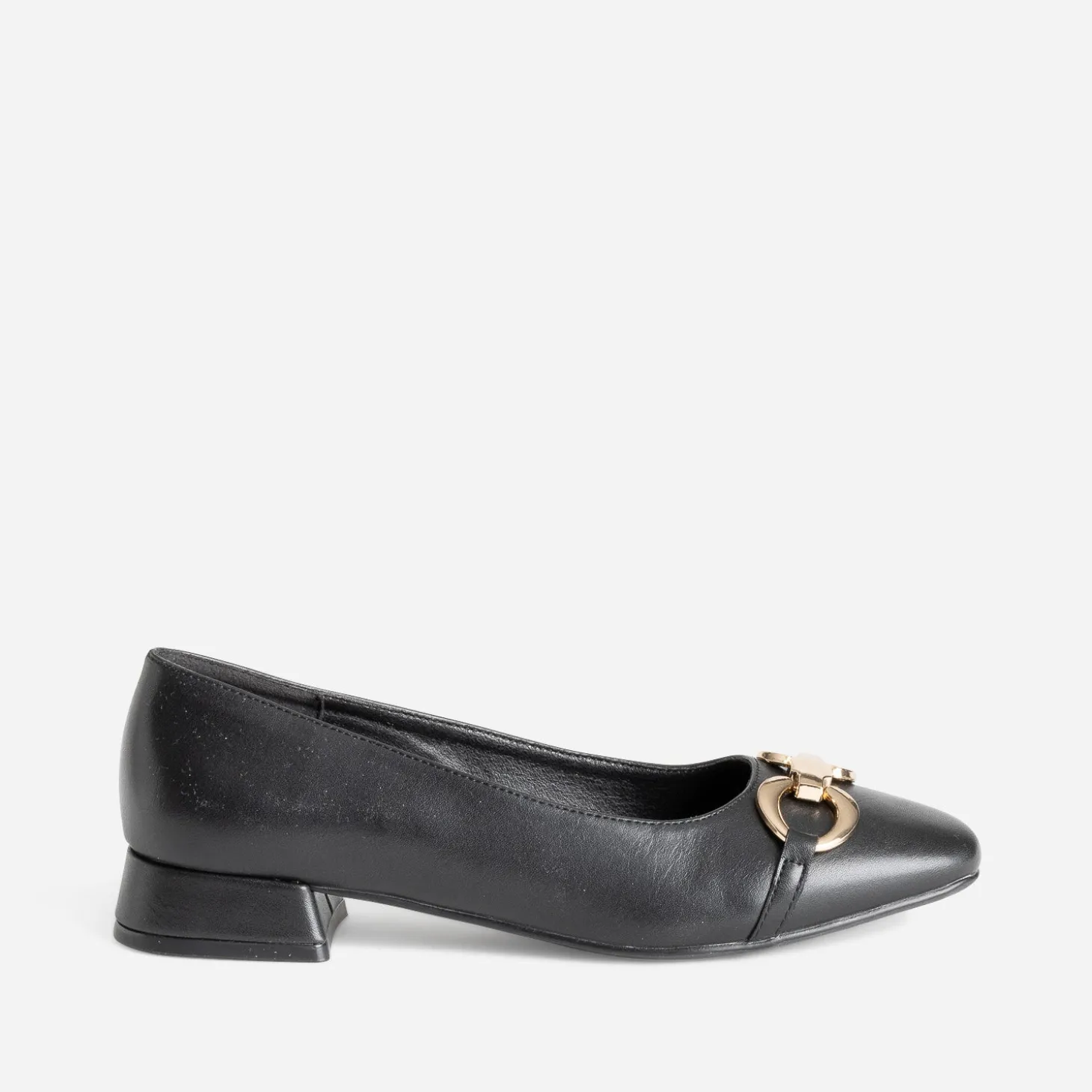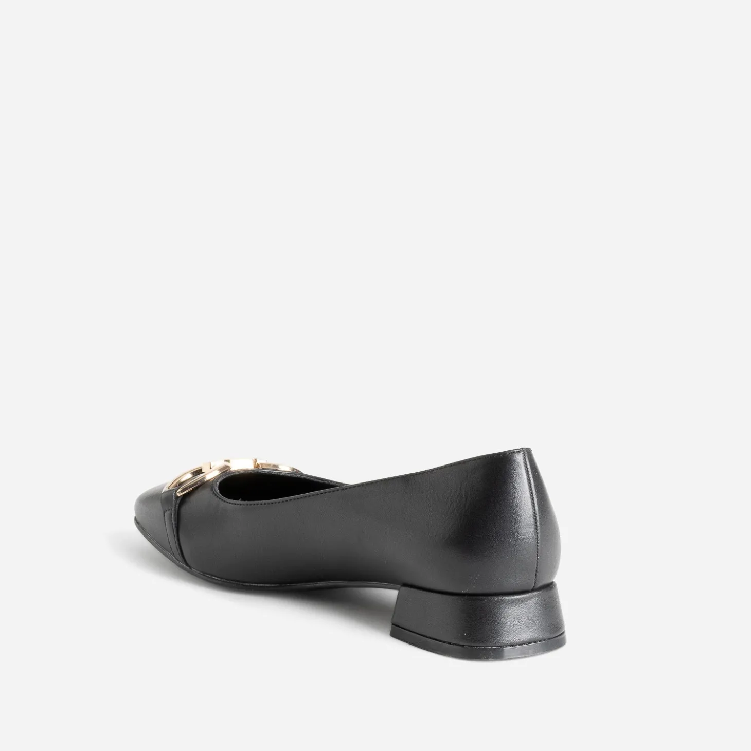 Avis aux adeptes de la ballerine, qu’importe les on-dit. Leur ligne séduit par leur minimalisme, leur coloris noir, par leur sobriété. Confectionnée en cuir, elle se démarque par un maxi détail bijou en métal doré et un petit talon de forme flare. Un modèle modernisé par un bout carré, à réserver avec un look classique et élégant.