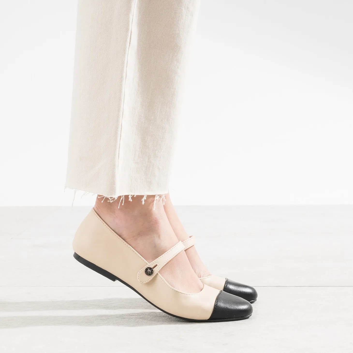 La star de la saison et de toutes vos tenues, c’est elle ! La ballerine confirme son retour gagnant, dans une version plate et un design tout en rondeur. En matière synthétique lisse, elle se décline en coloris beige avec bout contrasté noir, et présente, sur le dessus, une fine bride fermée par un bouton fantaisie. Un modèle aussi à l’aise avec un look sage, blouse à lavallière et jupe noire longueur midi, qu’avec un style plus audacieux, bombers sur jean à revers oversize.