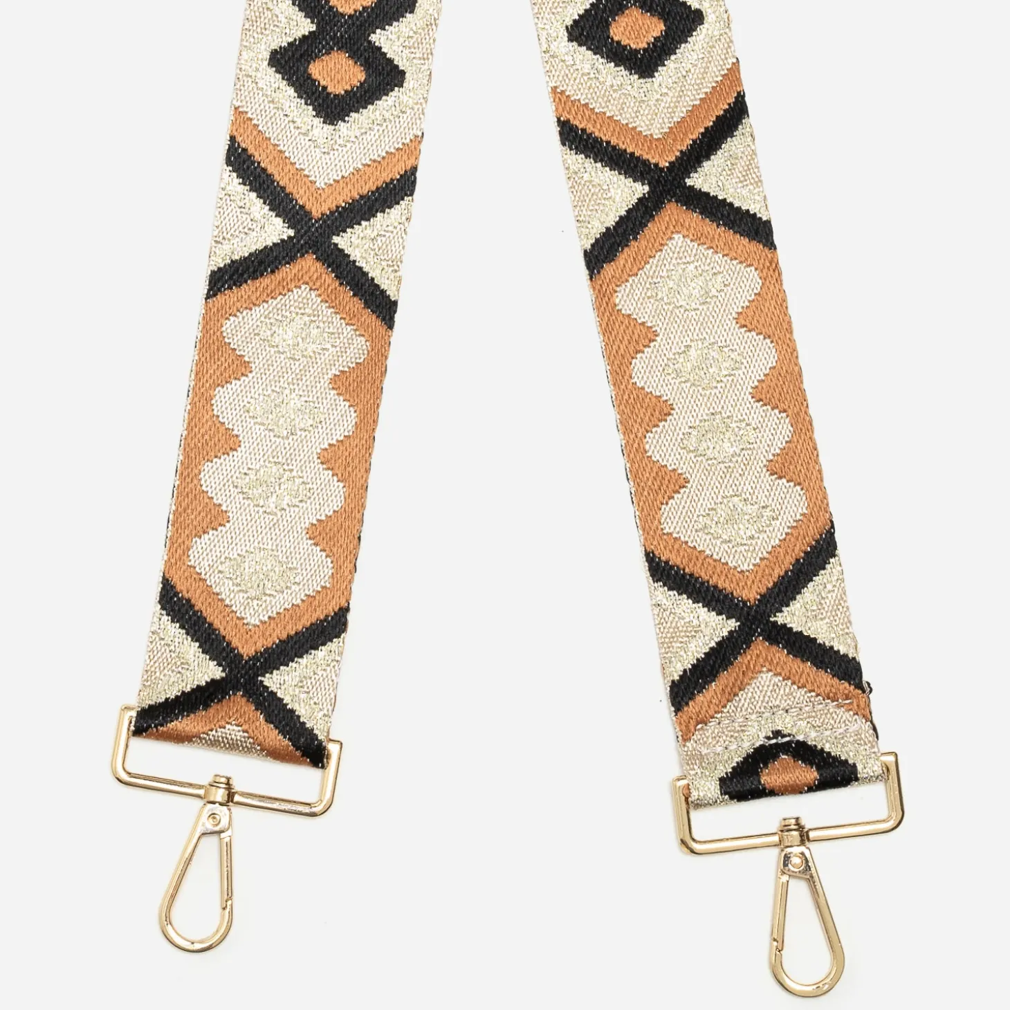 En textile beige, camel, noir et doré, cette bandoulière présente un tissage à motif ethnique. Amovible par mousquetons en métal doré, réglable, elle se place sur un sac à main, pour un porté sur l’épaule ou croisé.