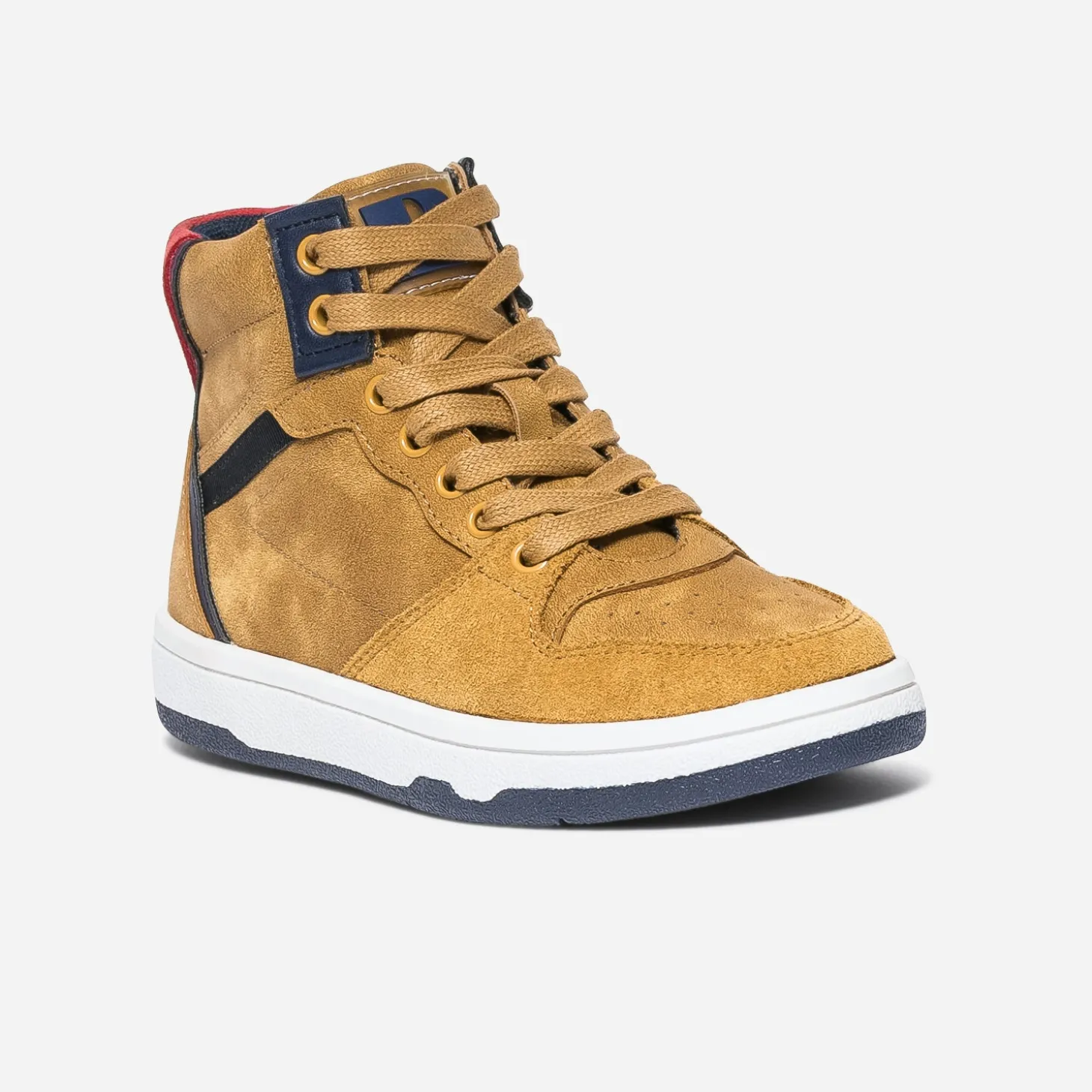 Coup de cœur immédiat pour cette nouvelle basket pour garçon. Coloris camel, elle est conçue en matière synthétique suédée, rythmée, ici et là, de touches bleu marine et rouges. Le lacet est doublé d’un zip intérieur, pour ne pas perdre de temps à se chausser.