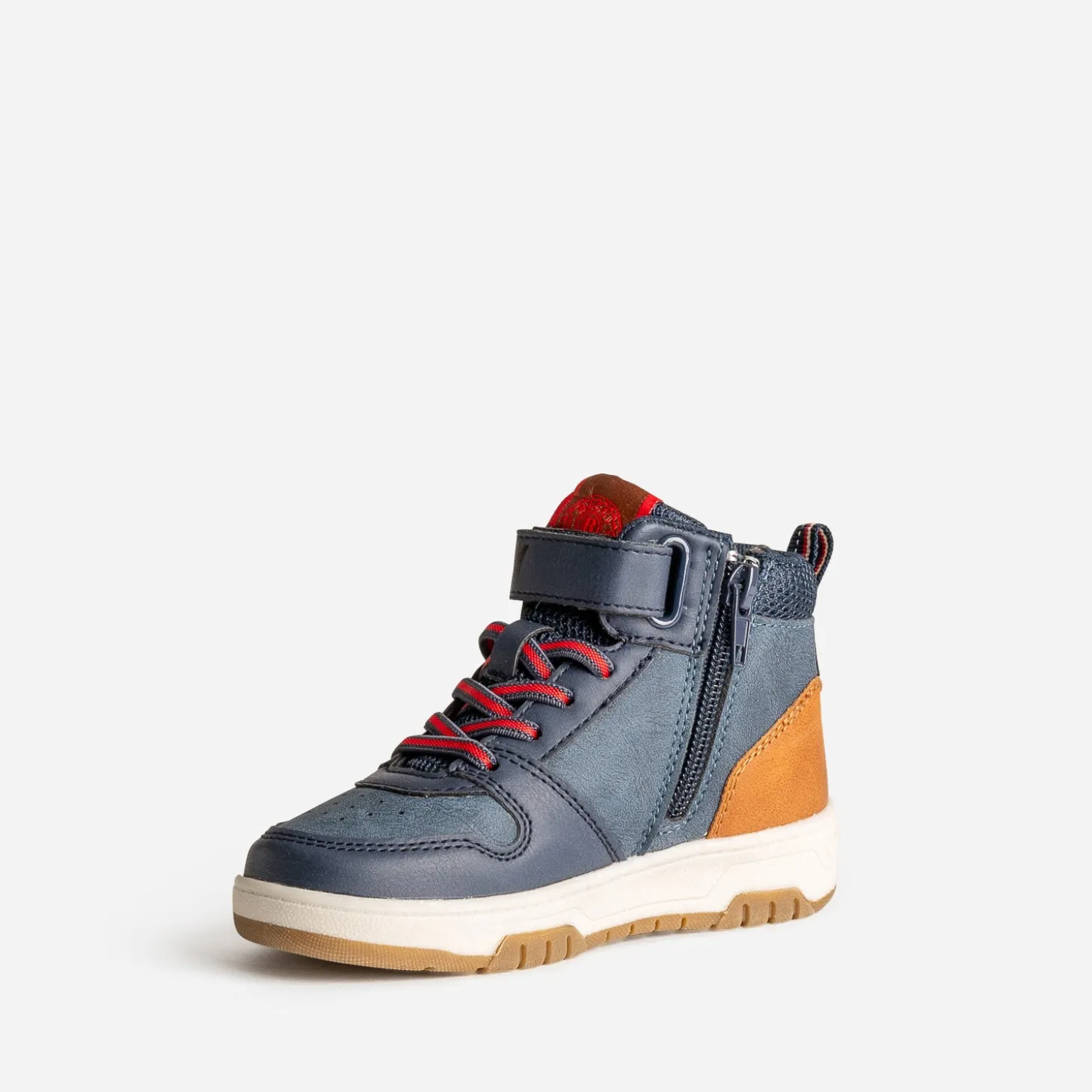 La basket connaît peu de concurrence quand il faut être confort et stylé. En matière synthétique bleu marine, elle multiplie les découpes et s’associe d’une part au mesh, d’autre part au camel et au rouge, pour affirmer son look. Lacet élastiqué, scratch et zip intérieur garantissent un maintien optimal du pied. Un modèle à porter avec un sweat à capuche oversize camel ou rouge sur un jean slim brut.