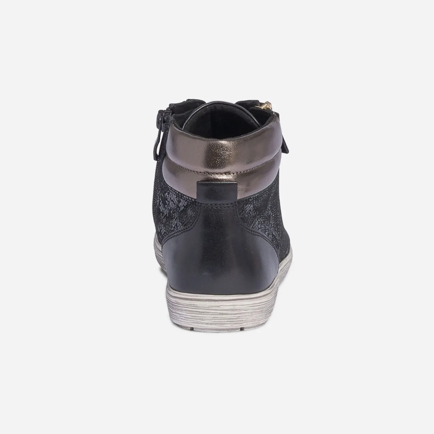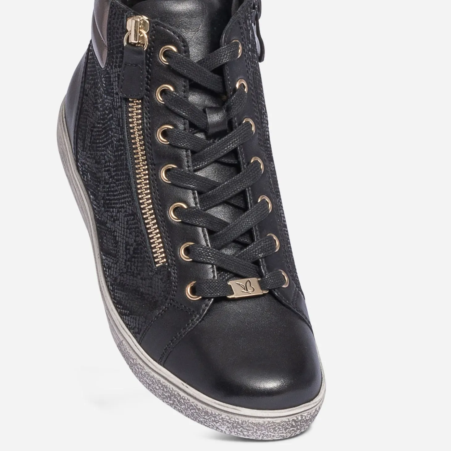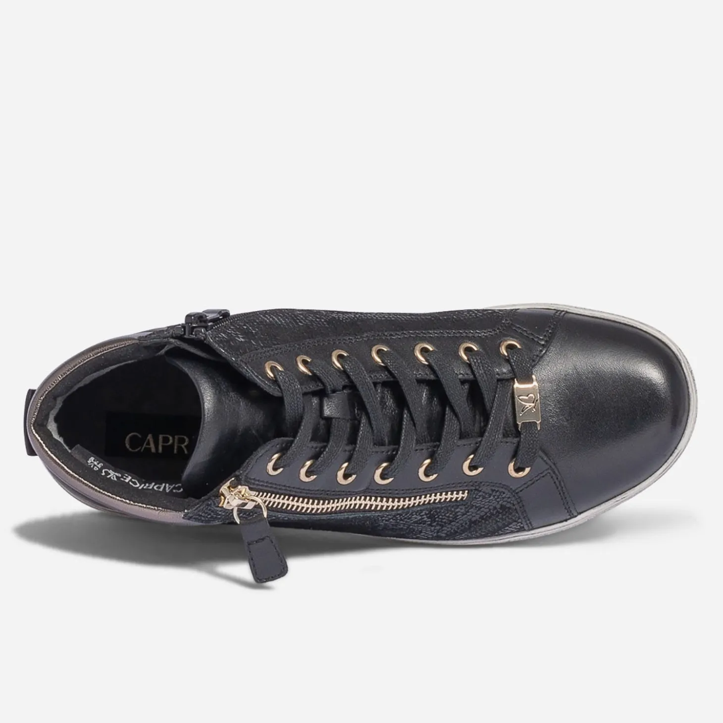Spécialiste du bien-être, la marque CAPRICE propose des chaussures au confort incomparable. Cette nouvelle basket dévoile une ligne simple, associant laçage et double zip sur les côtés. Laissez-vous séduire par son cuir noir ultra souple, animé d’un imprimé effet python sur les quartiers et d’un effet métallisé bronze sur le hait de tige matelassé. La semelle première en cuir est dotée de la technologie ‘onAIR’, garantissant un meilleur amorti et une aération optimale de la chaussure.