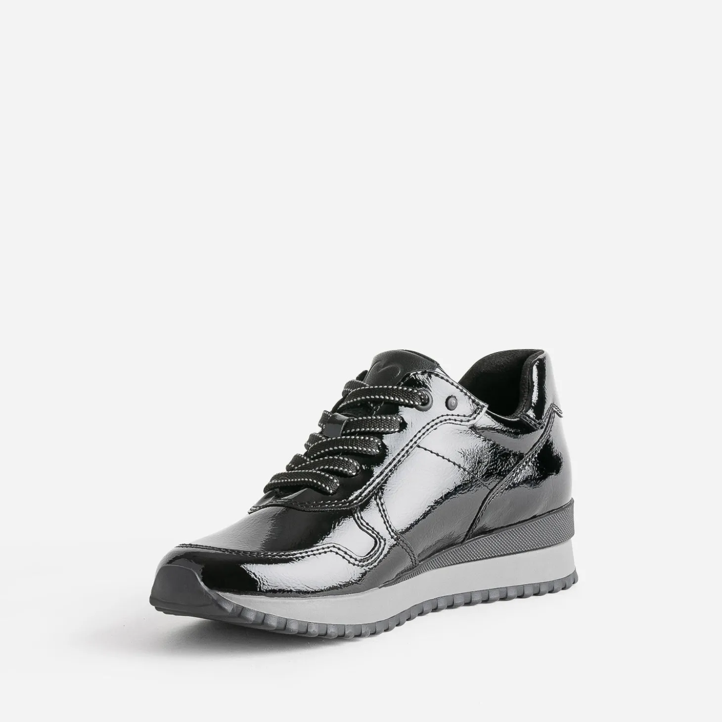 Modernité et style ne sont pas incompatibles. La preuve avec cette tennis femme. En matière synthétique noire, elle est twistée d’une finition vernie, au chic évident. Légèrement compensée, elle est parfaite pour l’entrée de saison.