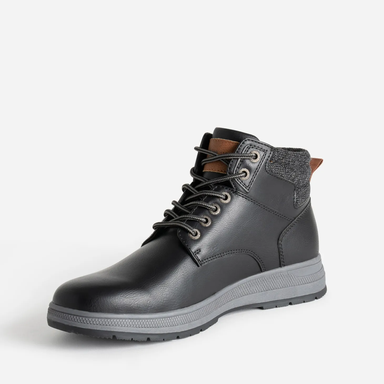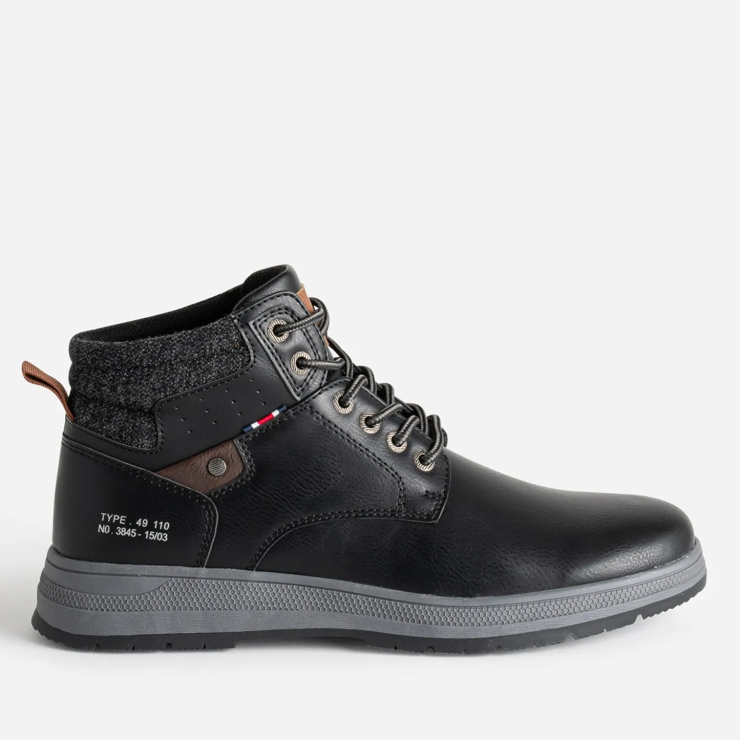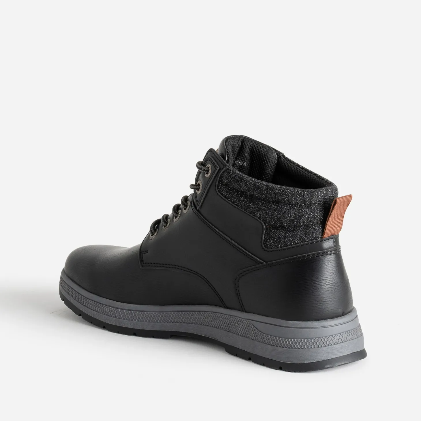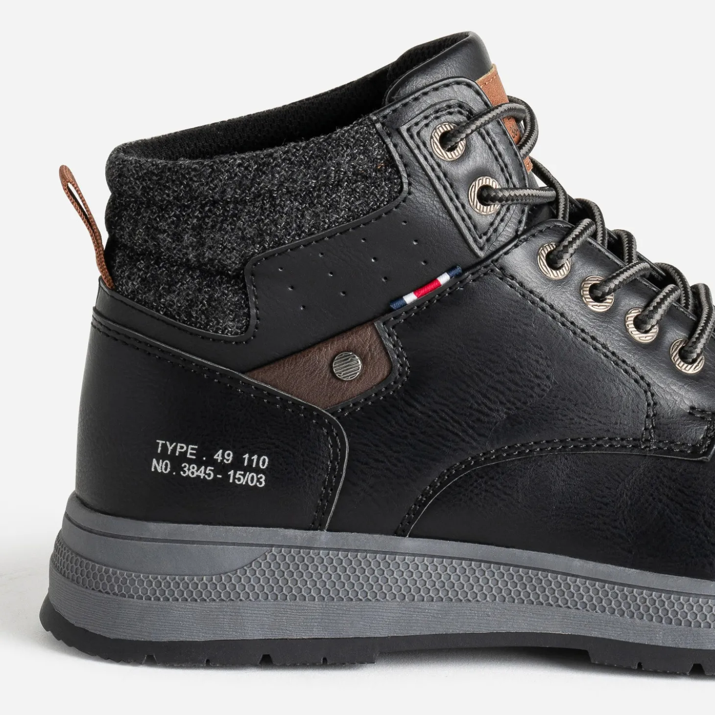 Boots ou basket ? Leur point commun, c’est leur tige montante. En matière synthétique noire, elle est finalisée par une tige en textile gris chiné matelassé et se ferme par un lacet esprit cordon. Un modèle à jouer avec un look esprit worker, composé de pièces en denim, plus ou moins délavées.