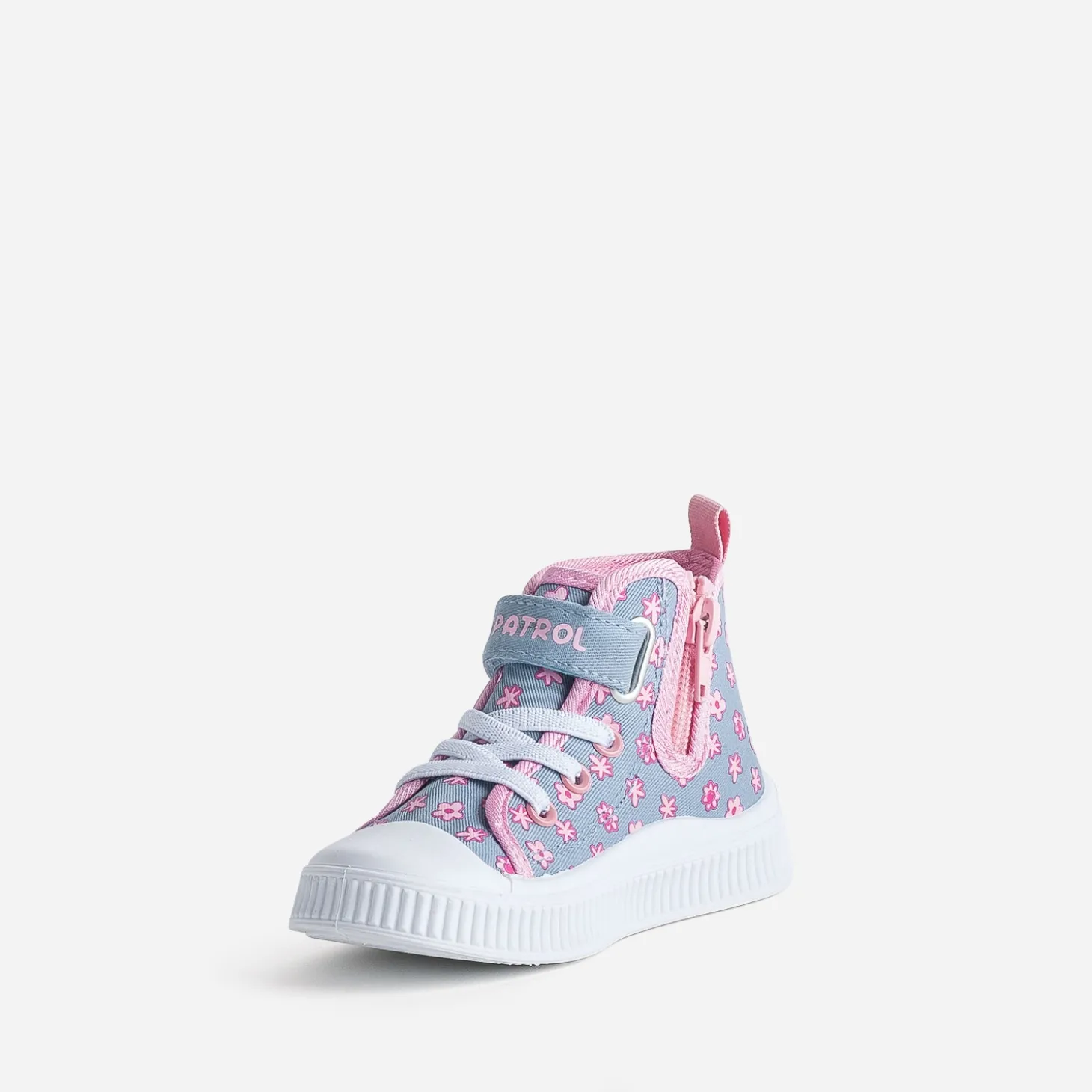 Elle mange Stella, elle dort Stella, elle rêve de rencontrer Stella ? Alors, n’hésitez pas ! Cette basket fille va lui plaire. En toile bleue, elle s’anime de petites fleurs roses, en écho aux œillets, à la doublure, au zip et à la ganse sur le contrefort. Lacet élastiqué et scratch l’accompagnent dans son l’autonomie.