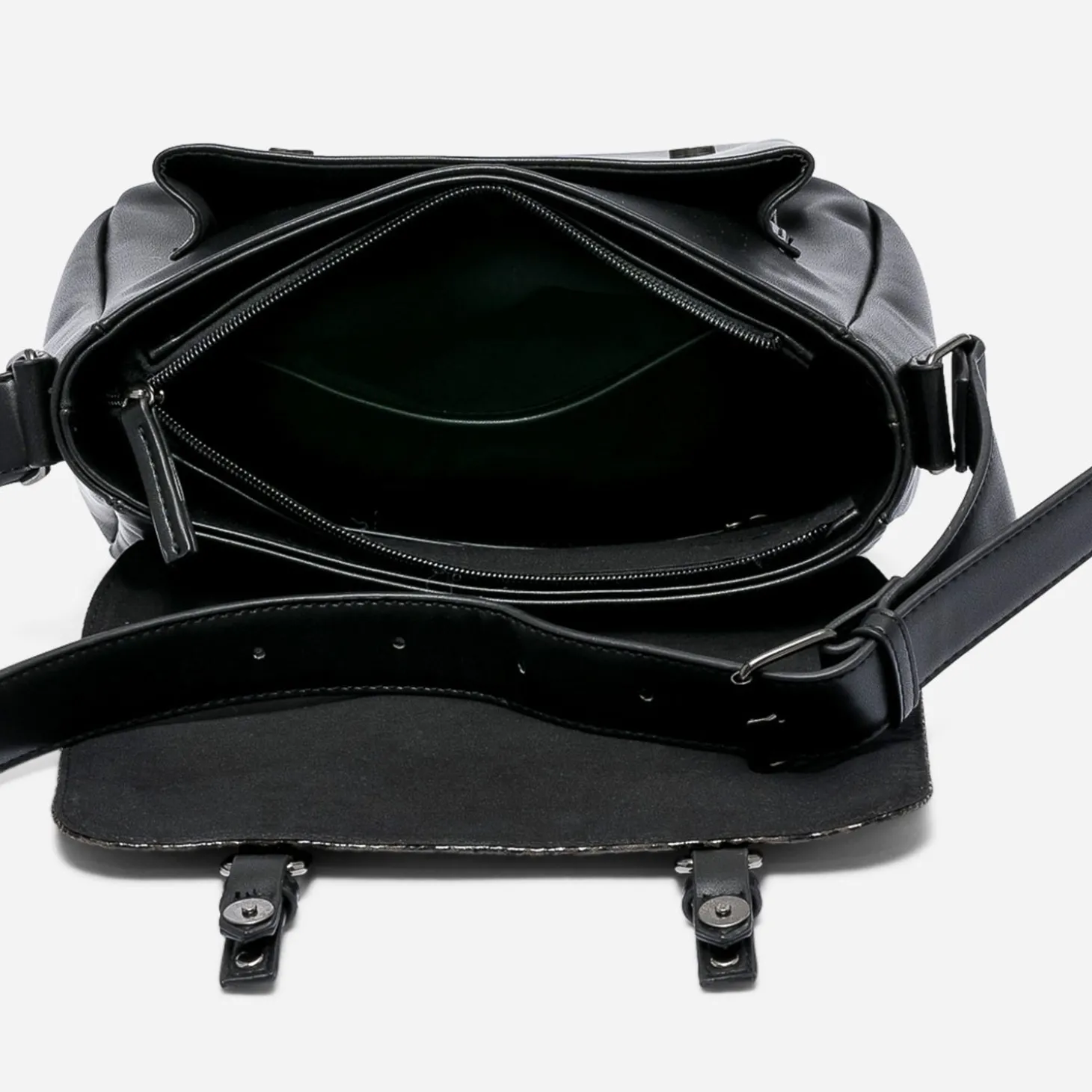 Fermeture par aimant et zip. 1 compartiment avec 2 poches dont 1 zippée. 2 poches externes dont 1 aimantée et 1 zippée. Bandoulière réglable non amovible.