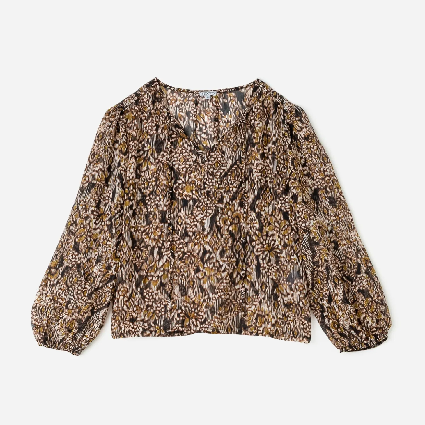 Une jolie blouse imprimée, c’est l’assurance d’un look facile à porter. En voile marron, elle se démarque par son imprimé ethnique floral, rehaussé de fines rayures dorées.