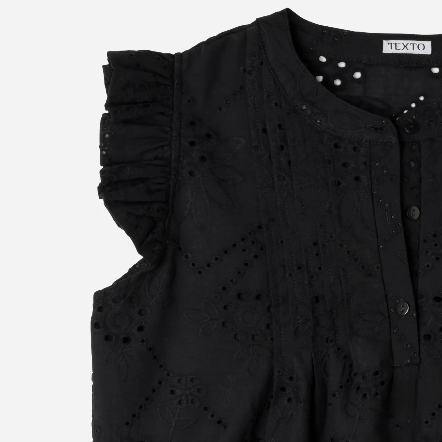 Forme droite, col rond, sans manches, volants aux emmanchures, plis cousus devant, fermeture par boutons.