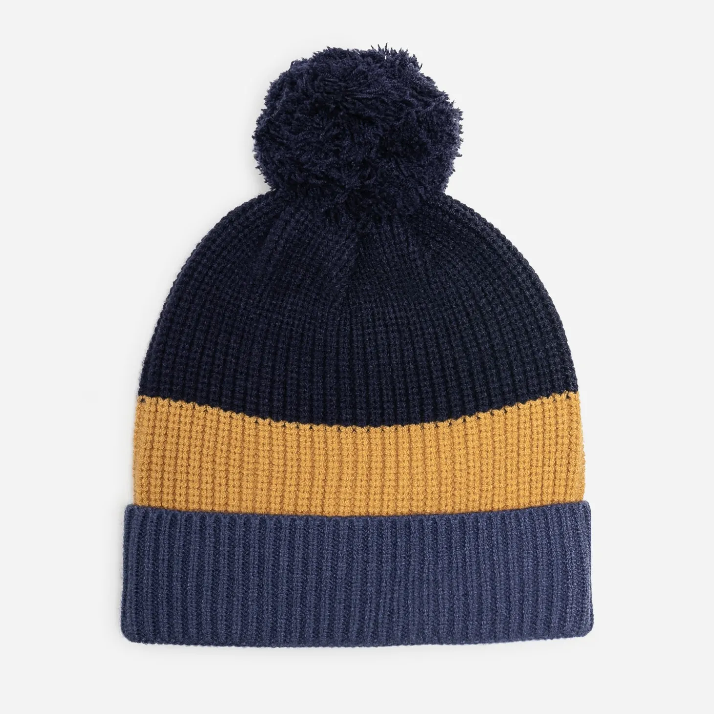 Bleu marine, camel et bleu moyen : trois couleurs à pour ce bonnet en tricot pour enfant. Il plaît pour ses larges rayures, son pompon et son revers, et pour son esprit mixte, facile à accorder avec les looks de la récré.