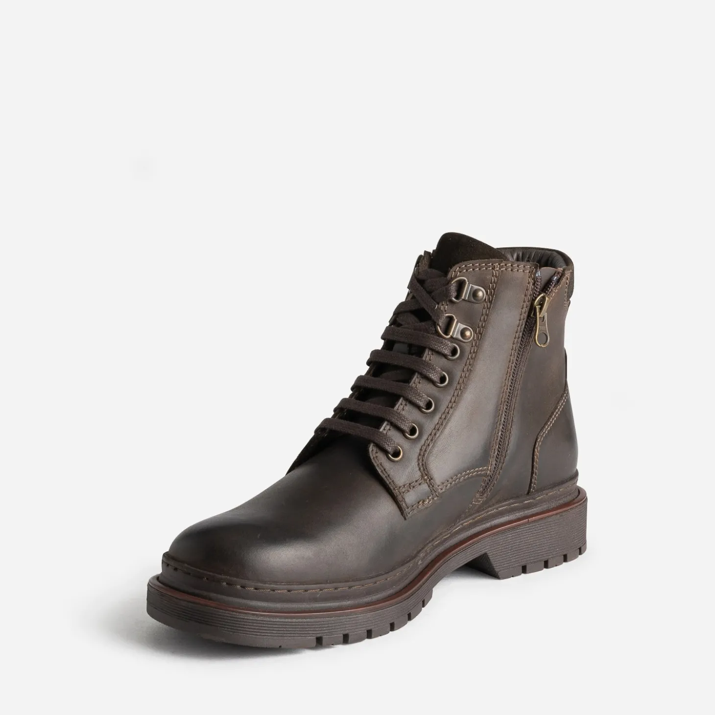 Coloris marron foncé, découpes placées, semelle crantée, empiècements en cuir velours et fermeture par lacet plat, doublée par un zip intérieur : ce boots homme est un must-have annoncé de la saison hiver. Adaptez un uniforme de style worker, en lui associant des pièces en denim.