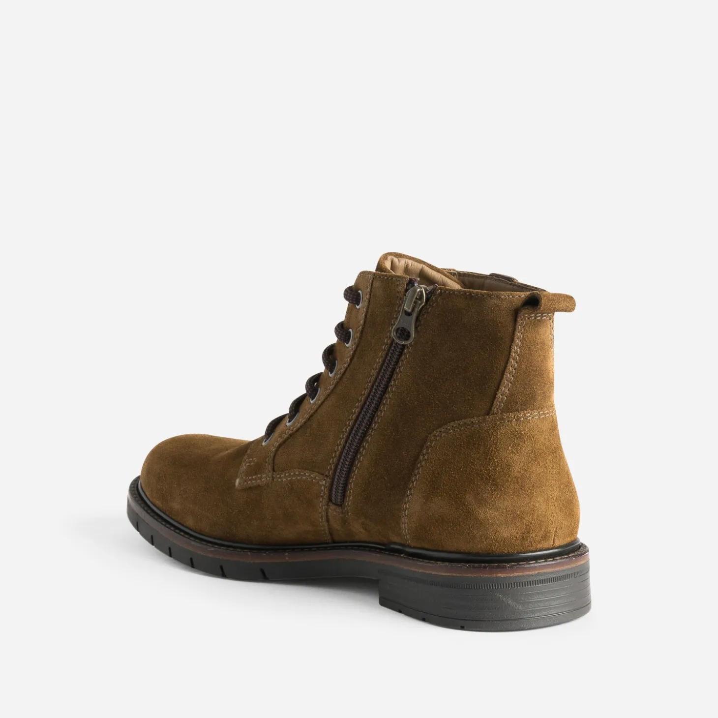 Changez des sneakers pour un modèle plus hivernal. Pour sa tige montante, pour son cuir velours, pour son coloris marron, à tendance kaki, le boots est une option sûre. Monté sur semelle légèrement crantée, fermé par un lacet cordon, il est l’allié de vos jeans, brut, noir ou gris.