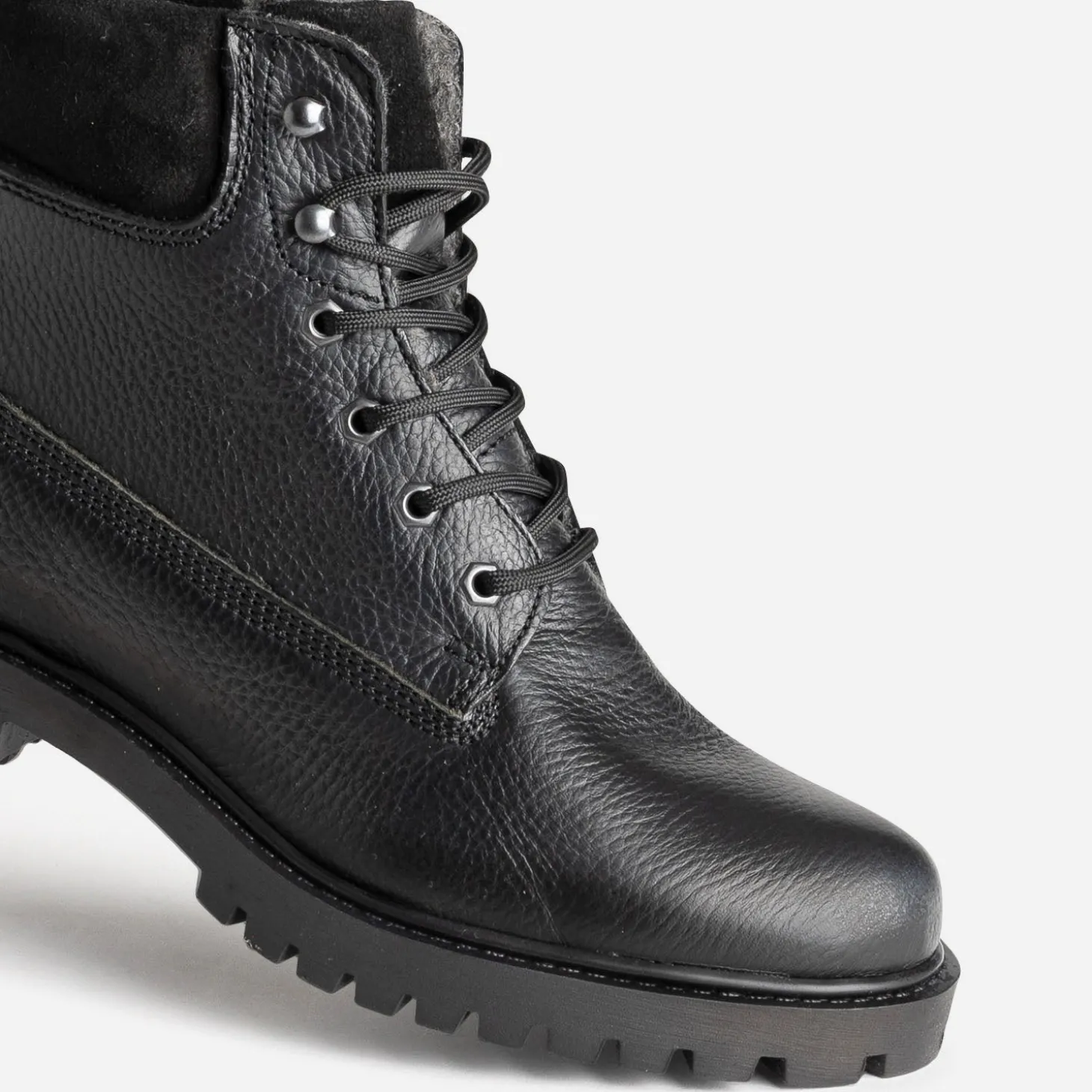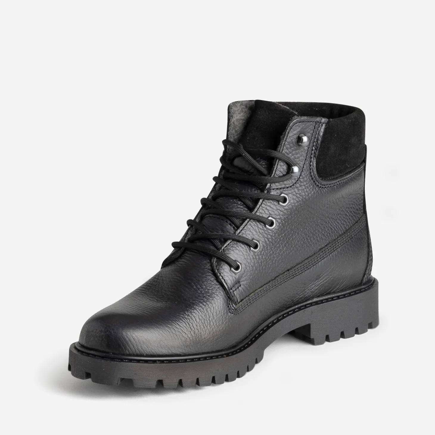 Ce boots en cuir noir pour homme est conçu pour l’hiver. Il présente une semelle crantée, une tige matelassée, un contrefort bi-matière et une doublure fourrée pour un confort optimal et se ferme par un lacet rond ton sur ton. Un modèle inscrit dans la tendance workwear, à porter avec un jean et une surchemise ou une parka bien chaude.