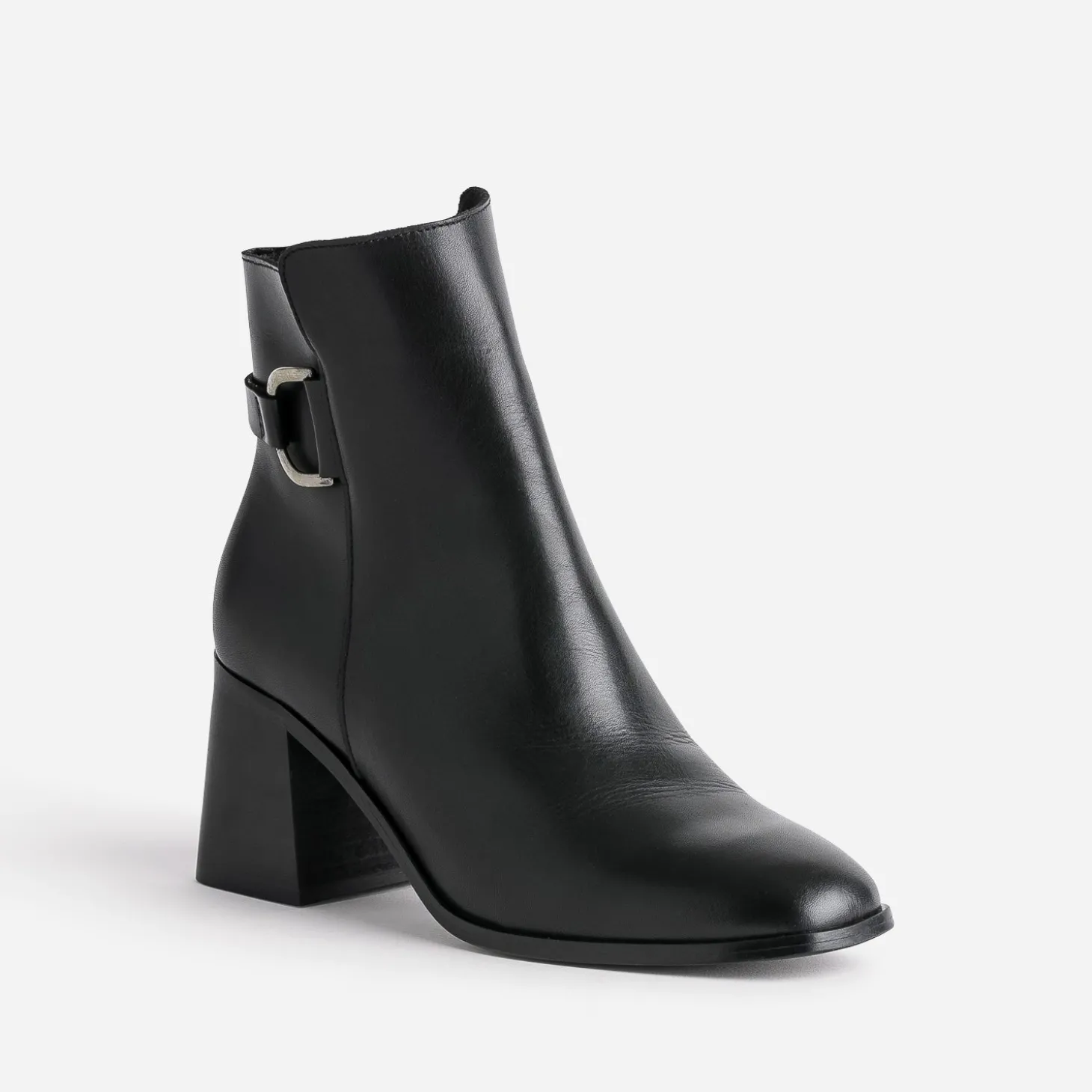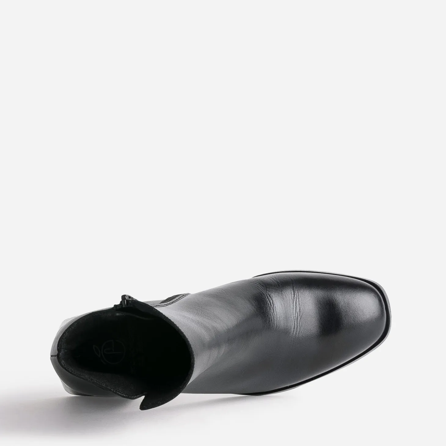 Le boots femme a ce je-ne-sais-quoi d’intemporel et d’élégant, en toutes circonstances. En cuir noir, il est monté sur un talon légèrement flare de 7 cm, présente un bout carré et une tige asymétrique, soulignée d’une bride arrière avec un anneau en D. En costume-pantalon ou en robe fluide, il affectionne le style masculin-féminin, sans pareil.