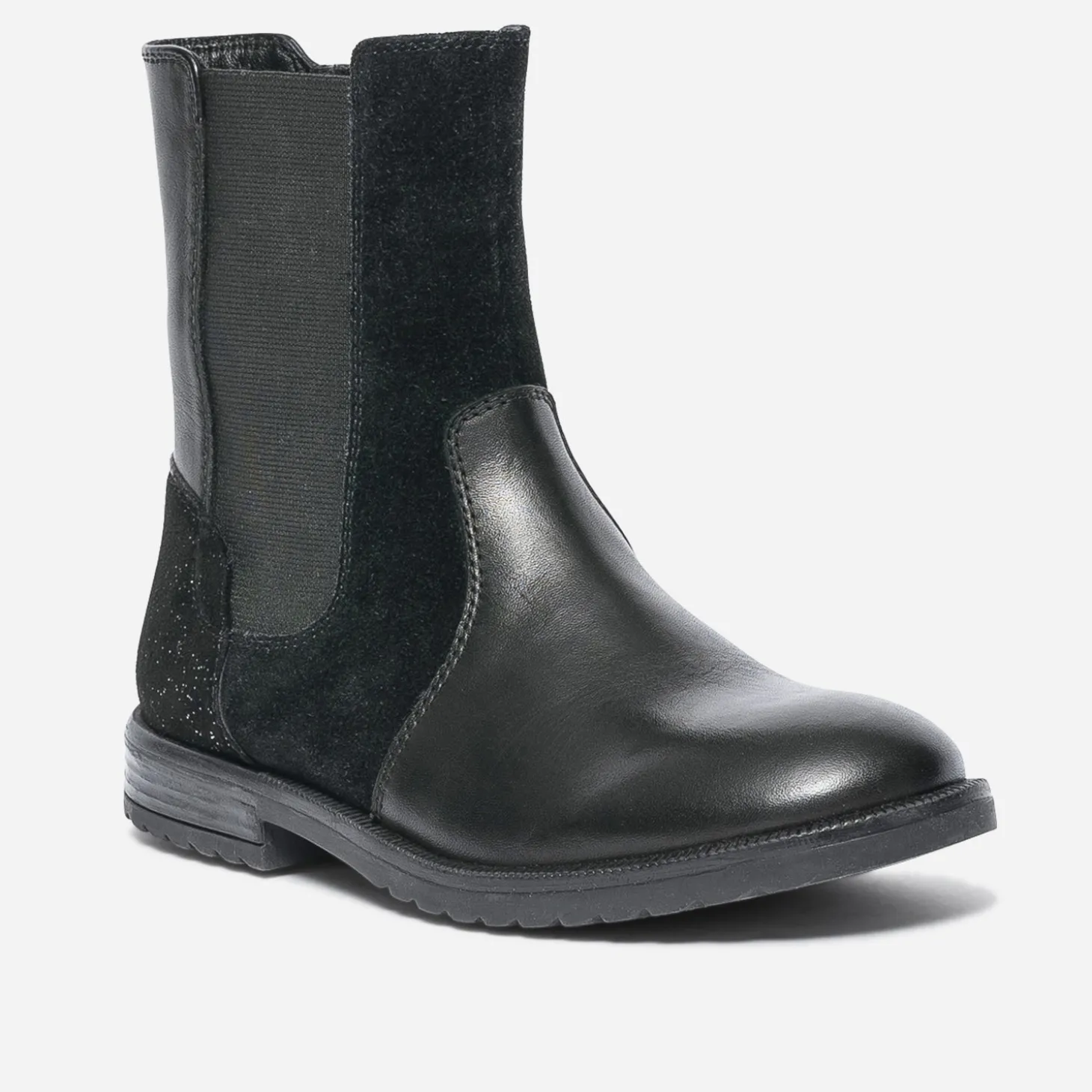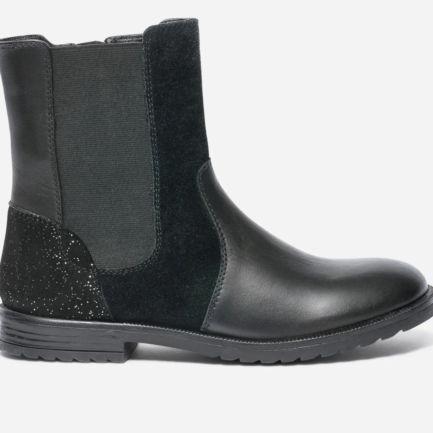 Pieds mini, style maxi. Mix de cuir et cuir velours noirs, ce boots fille se laisse twister d’un empiècement irisé sur le contrefort. Elastique d’un côté, zip intérieur de l’autre côté, il s’enfile facilement. Un modèle idéal pour faire le show dès la rentrée !
