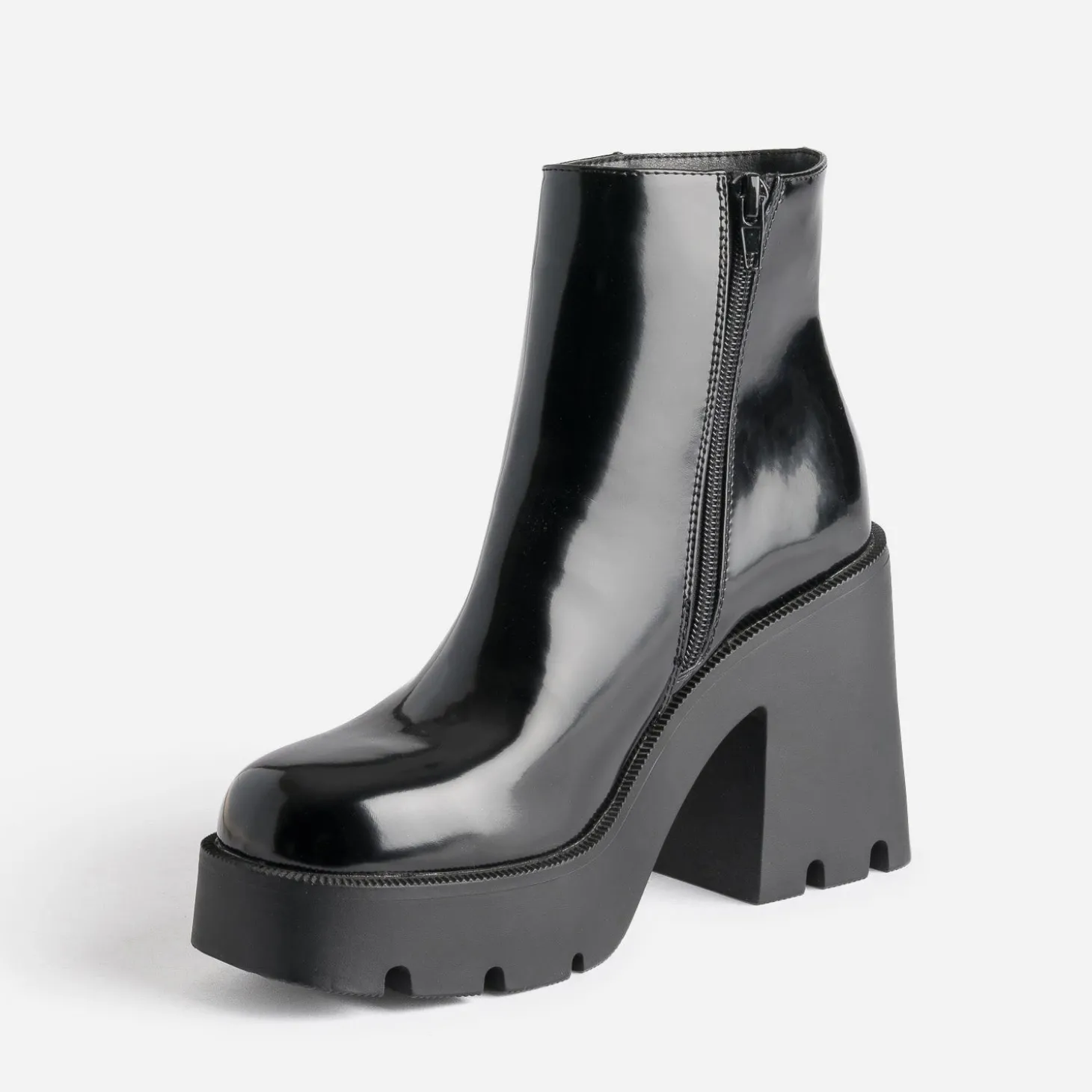 Monté sur une semelle épaisse et crantée à plateforme, ce boots défend un look rétro-rock évident. En matière synthétique noire, il s’offre une finition glacée, et une ligne imposante, qui allonge la silhouette de 10 cm à l’arrière et 3 cm à l’avant. Total look black recommandé, avec pull côtelé à col cheminé et jean skinny, pour une silhouette parfaitement dessinée.