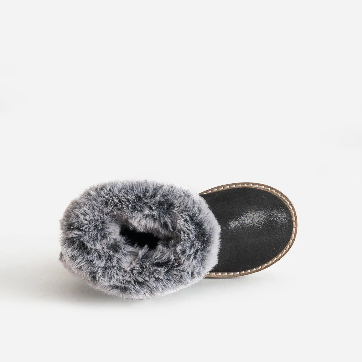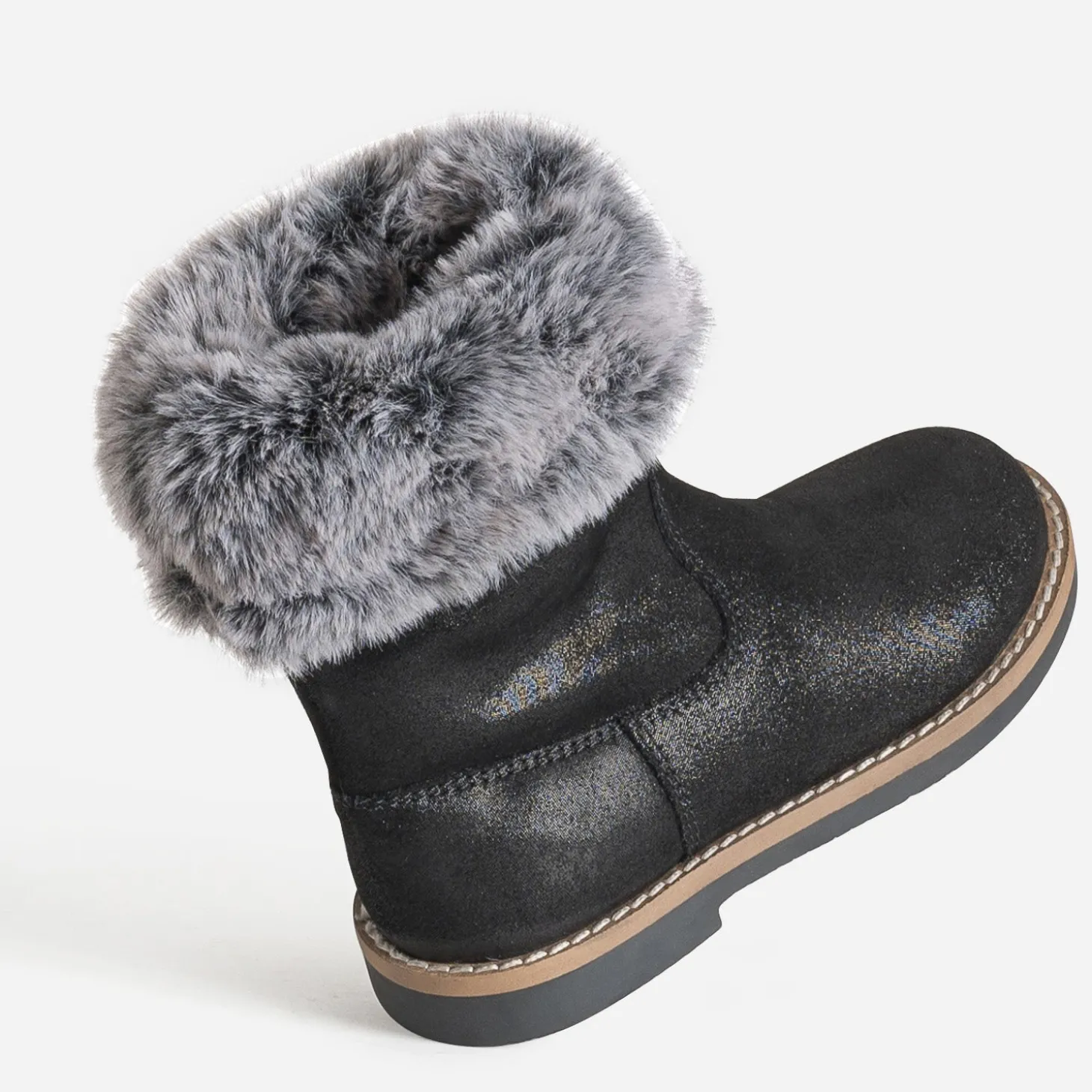 Cette botte pour fille pourrait devenir le modèle incontournable de la saison. D’abord, pour son cuir velours, avec une finition irisée. Ensuite, pour sa tige doublée de fourrure synthétique ; tige à double porté, haute ou avec revers, pour multiplier les styles. Un modèle très à l’aise avec les robes et jupes de la saison.