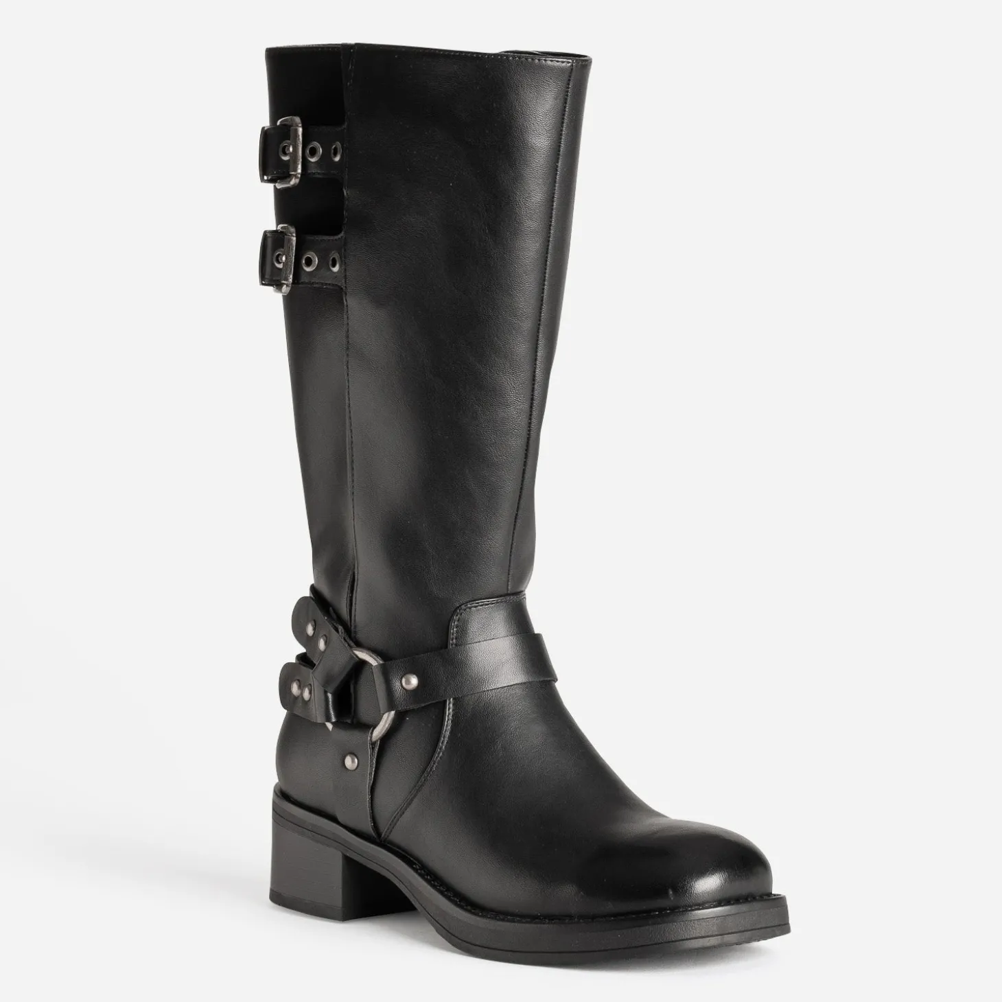 La tendance motard fait un retour remarqué. A vos pieds, la botte s’impose. En matière synthétique lisse noire, elle présente un bout carré, un talon large, très stable, et une tige avec soufflet, qui privilégie l’aisance du mollet. Bride en T avec anneau métal et décor clous, double bride ajustable par boucle, les détails se font signature d’un style qui n’a plus rien à prouver. Un modèle très mode, à préférer avec un pull à col roulé et une mini jupe en cuir, ou un slim glissé à l’intérieur.