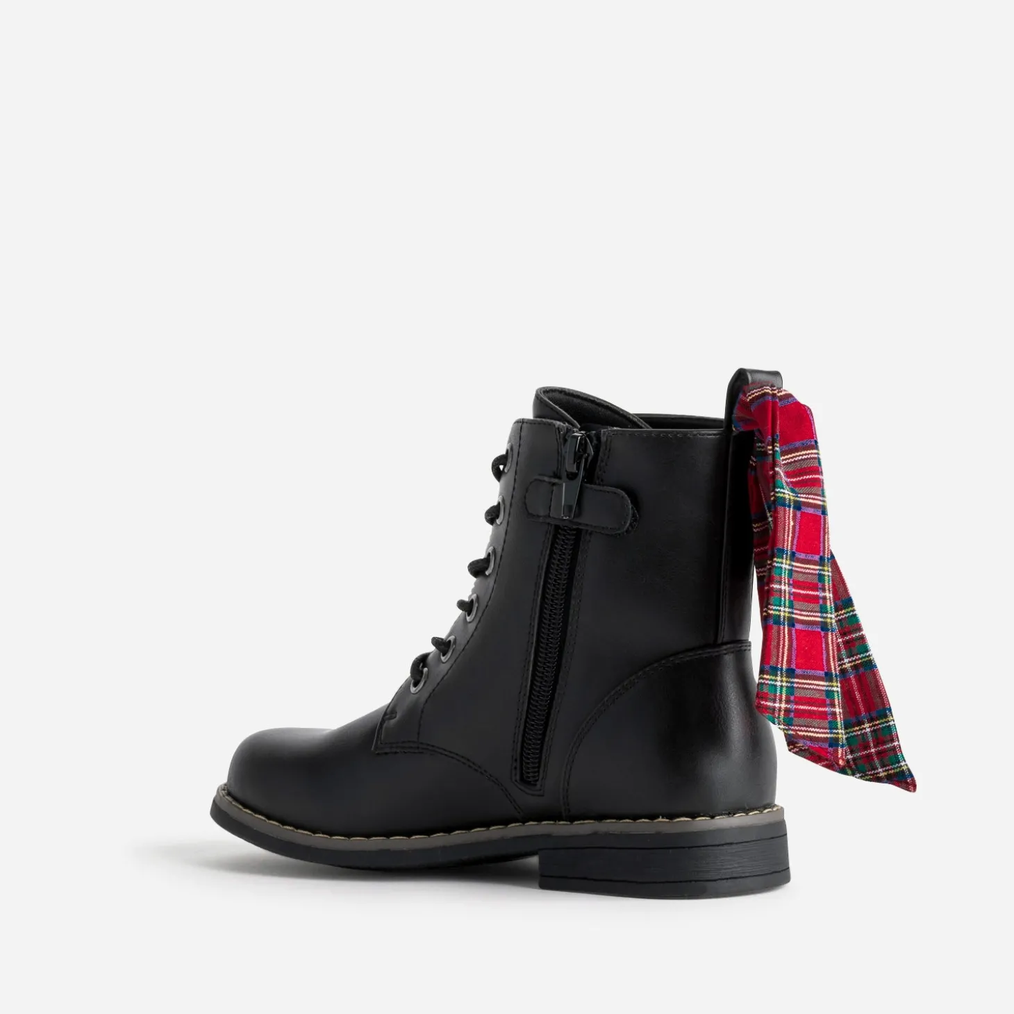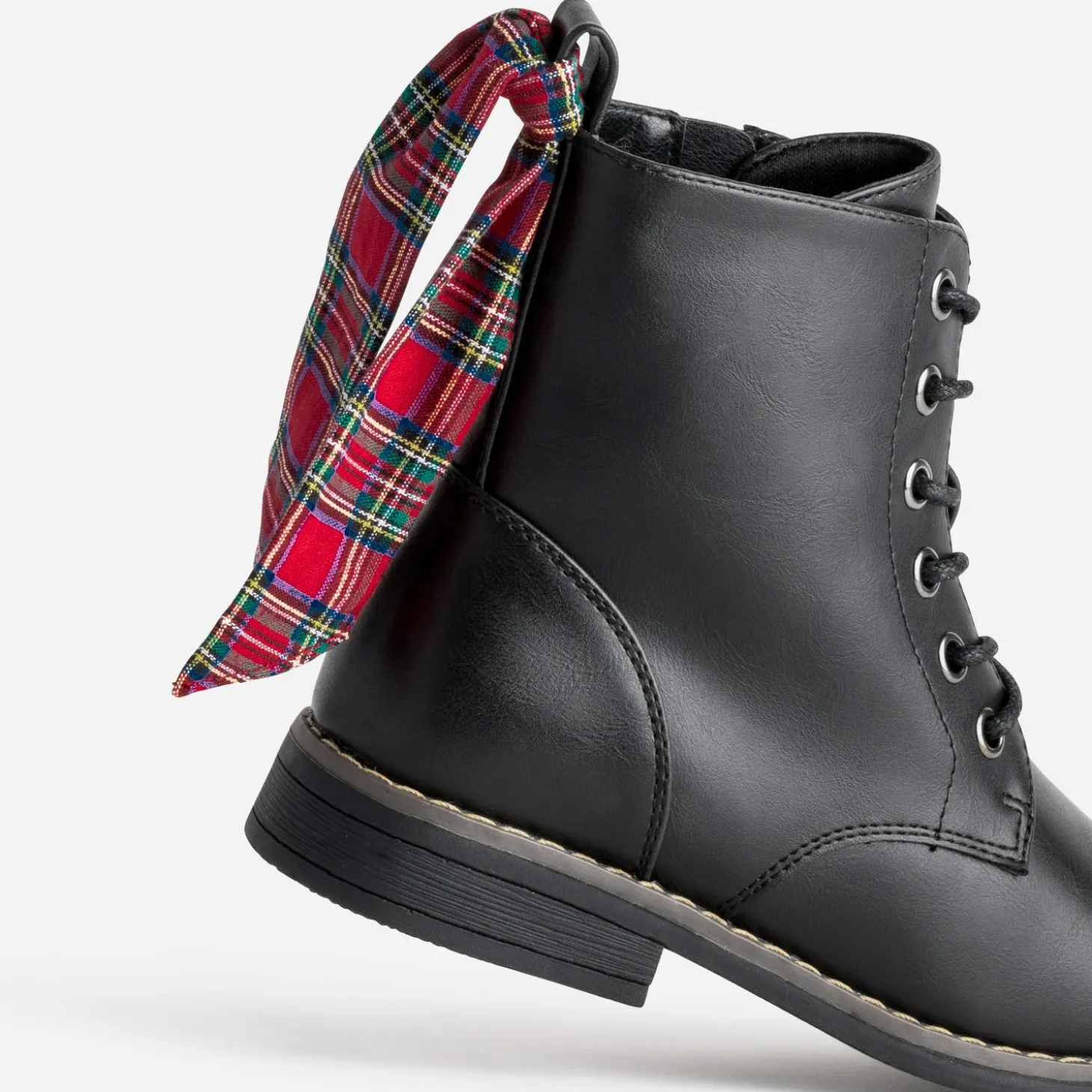 Celle que votre fille ne va pas quitter de si tôt, c’est la bottine. En cuir noir, elle monte au-dessus de la cheville et se ferme par un lacet, renforcé par un zip intérieur. Son détail qui change tout ? Des rubans amovibles, écru à motif léopard ou rouge à motif tartan, à nouer, ou pas, à l’arrière de la tige. Un modèle facile à associer avec ses looks de rentrée et de plein hiver.