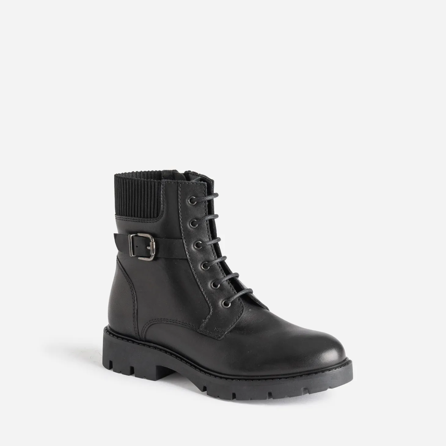 Tige montante et lacée, semelle crantée, textile côtelée et boucle décorative, cette bottine pour junior fille est un must have de la saison. Réveillez son esprit rock, au quotidien.