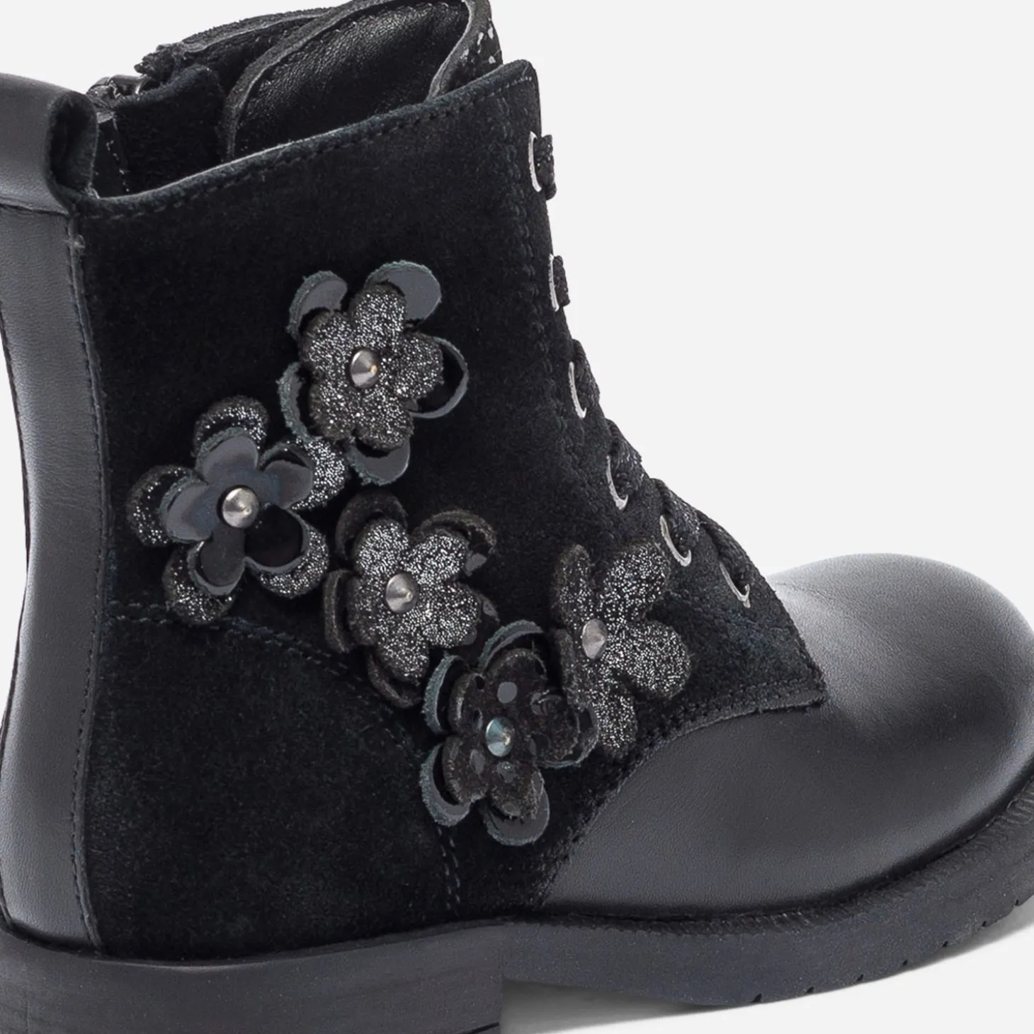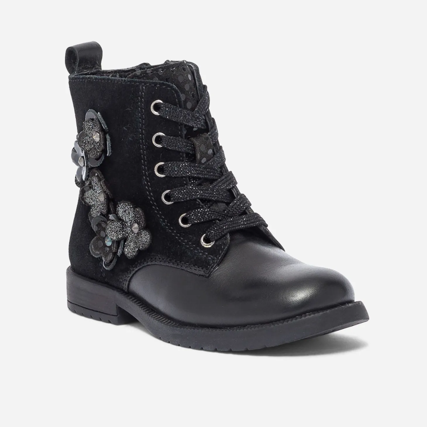 Voilà une bottine pour fille qui fait, des dualités, sa force de style. Noire, elle associe cuir lisse et cuir velours dans un équilibre parfait. Plutôt rock, elle s’adoucit d’un décor de fleurs 3D posées sur le côté. Fermée par un lacet, elle s’ouvre aussi plus facilement grâce au zip intérieur. Un modèle qu’elle devrait vite adopter !