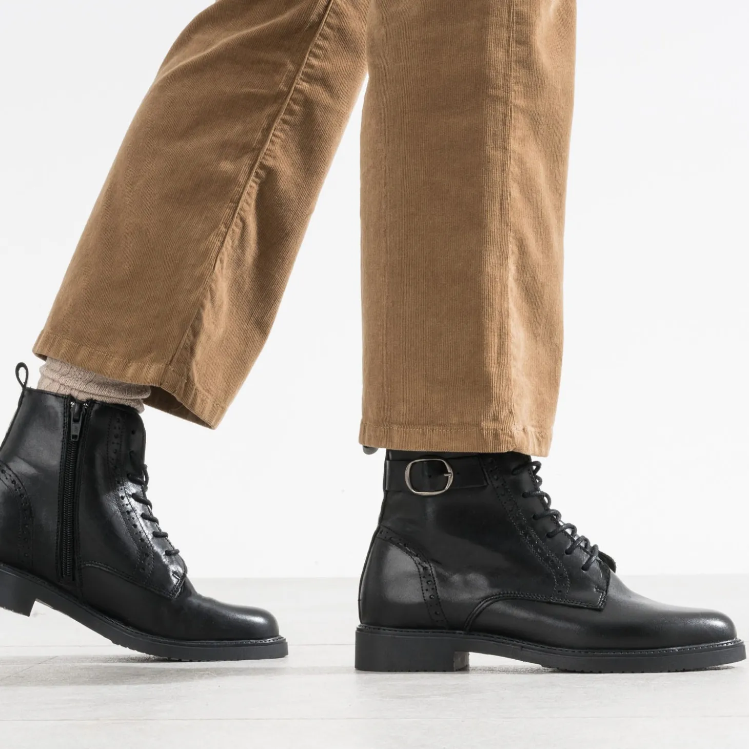 La saison est marquée par le retour du cuir en premier plan, à porter comme une seconde peau. La bottine n’y échappe pas ! En cuir lisse, elle opte pour un coloris noir, intemporel, et des détails de perforations sur la patte de laçage et le contrefort. Le zip intérieur facilite l’entrée et la sortie du pied. Un modèle à privilégier avec un blouson aviateur, un pull chaussettes, une jupe midi en cuir et des chaussettes hautes.
