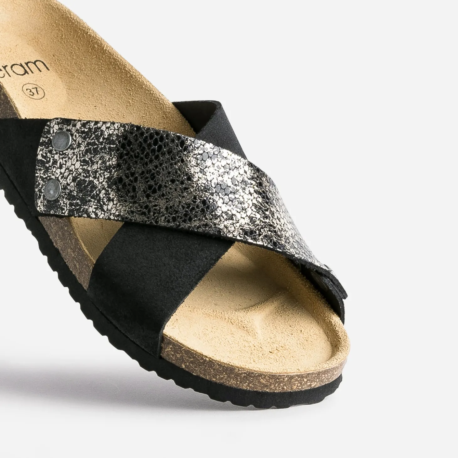 Twistez votre mule anatomique JULY par une nouvelle bride, amovible par pressions. En cuir imprimé effet python, elle associe le doré et le noir dans une belle harmonie.