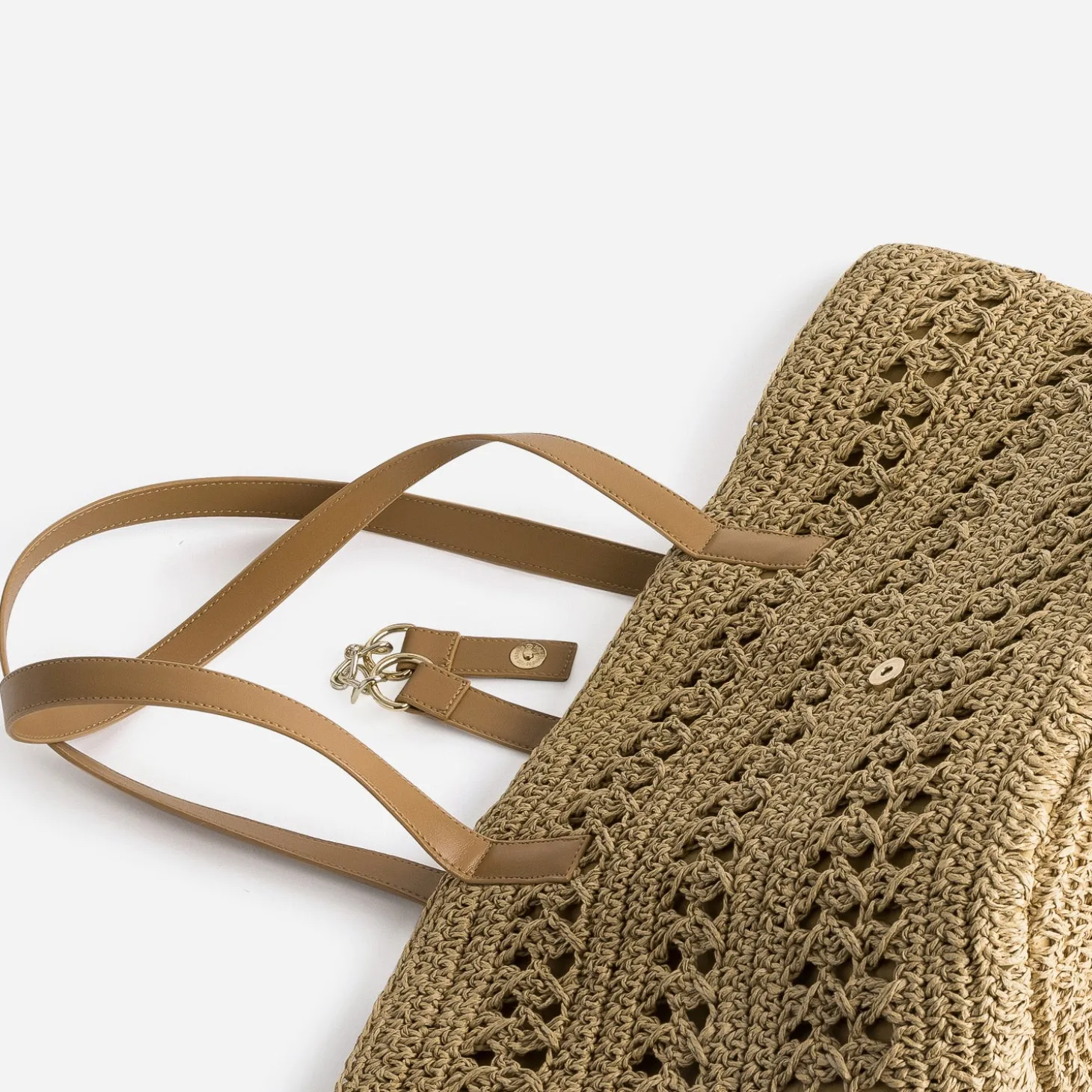 Jamais trop grand, le cabas s’impose dans le dressing d’été, dans une version raphia, avec tressage ajouré. Beige foncé, il est doublé de textile ton sur ton, rehaussé par des touches en matière synthétique camel, sur les anses pour un porté épaules et une patte-bijou en fermeture. Un véritable it-bag, du bureau jusqu’à la plage, avec des pièces en lin ou des robes longues vaporeuses.