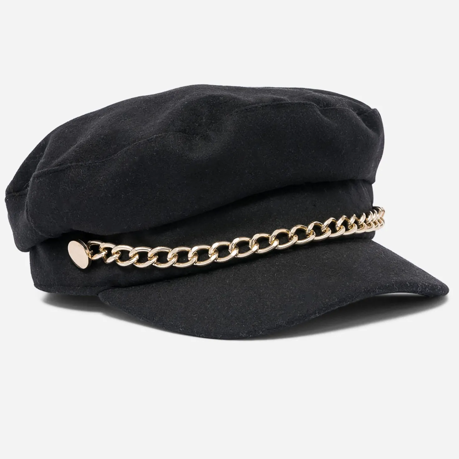 Se protéger du froid avec style, c’est tout un art. Testez la casquette inspirée par l’uniforme marin. En textile feutré noir 100% laine, elle est décorée, sur le devant, d’une grosse chaîne en métal doré façon bijou =. Un modèle qui va faire, sans aucun doute, son petit effet, avec un blazer noir et un pantalon flare en velours.
