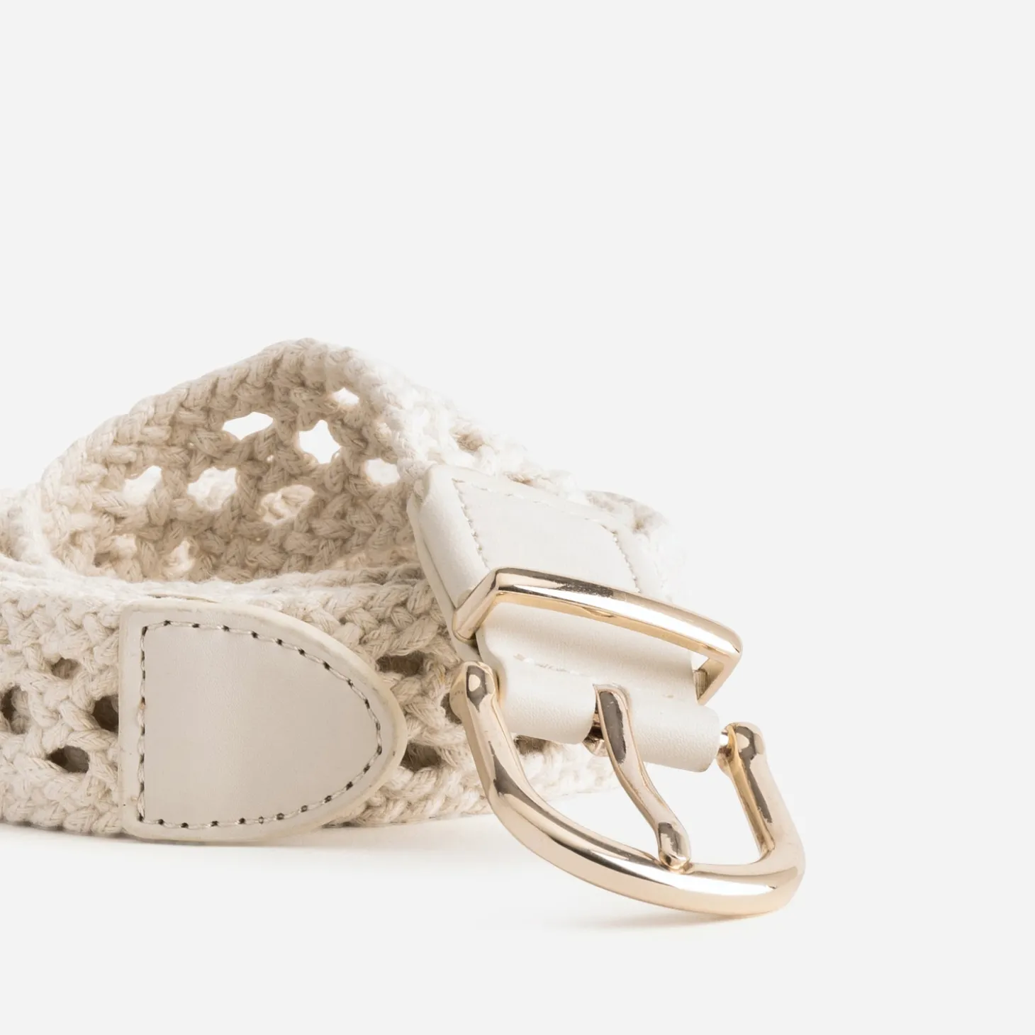Dans le style bohème, on liste la broderie anglaise, la dentelle, le raphia ou le macramé. Cette ceinture en textile écru se démarque par son tressage ajouré spécifique, finalisé par une boucle en métal doré. Un modèle idéal pour cintrer la taille d’une robe, qu’importe votre morphologie.