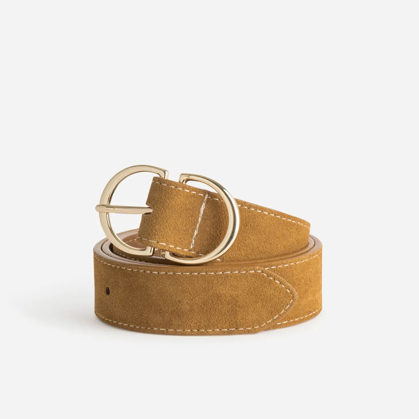 La ceinture camel en cuir velours offre un toucher doux et agréable. La boucle dorée à double anneau en miroir en métal jaune apporte une touche sophistiquée. Un accessoire à imaginer avec une chemise blanche, un blazer marine et un jean bleu, en journée, avec un pull beige, un jean blanc et des mocassins à motif léopard en soirée.