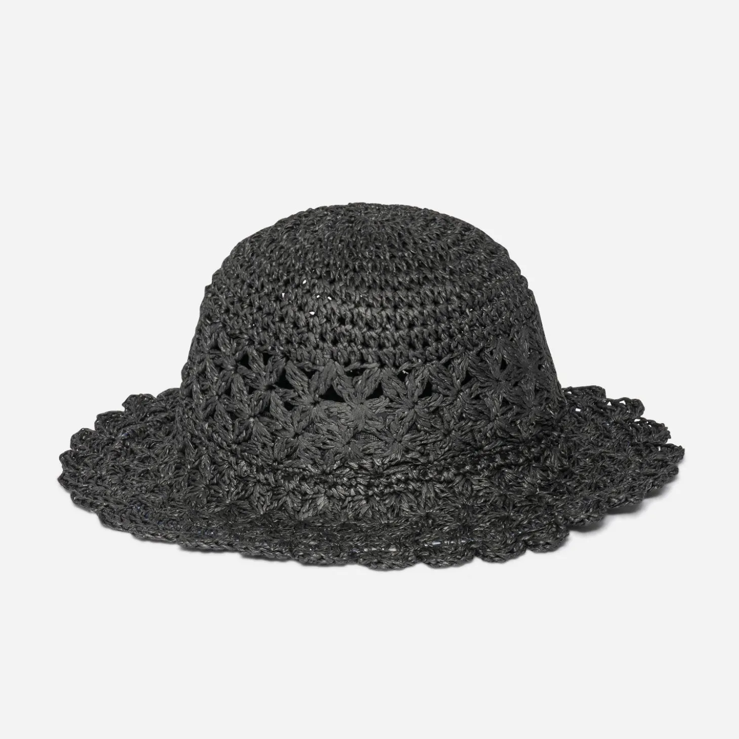 Inspiration forme cloche pour ce joli chapeau d’été. En papier recyclé, il séduit par son tressage ajouré et son coloris noir. Un accessoire qui signe un esprit bohème chic, avec une robe longue noire en broderie anglaise et une paire de sandales compensées en cordes.