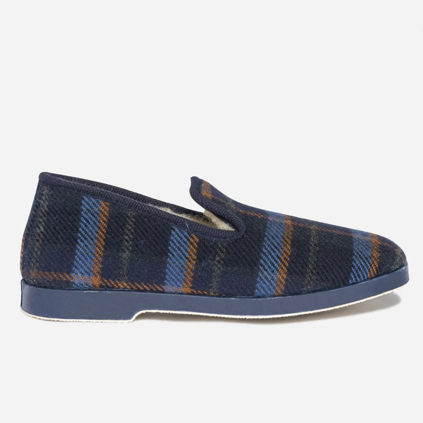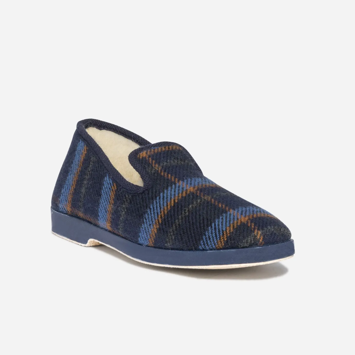 La charentaise est, par définition, une pantoufle fourrée, en tissu, à carreaux. Un chausson originaire des Charentes, devenu pièce iconique en terme de confort et de chaleur chez soi. Rythmé de rayures bleues, kaki et camel sur fond bleu marine, ce modèle homme reprend les codes traditionnels, avec doublure 100% laine.