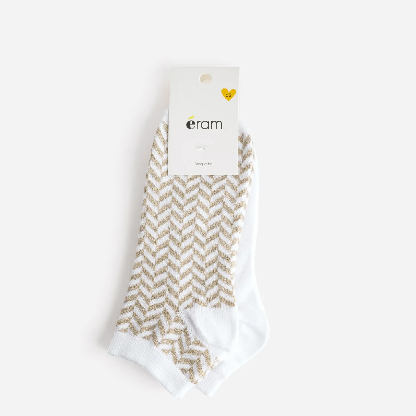 Blanches et unies. Blanches à motif chevrons dorés. Deux paires de chaussettes courtes, indispensables avec vos baskets basses préférées.