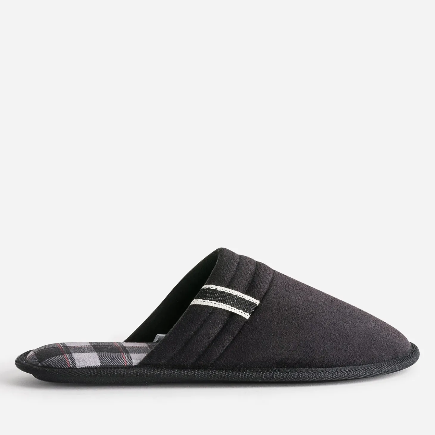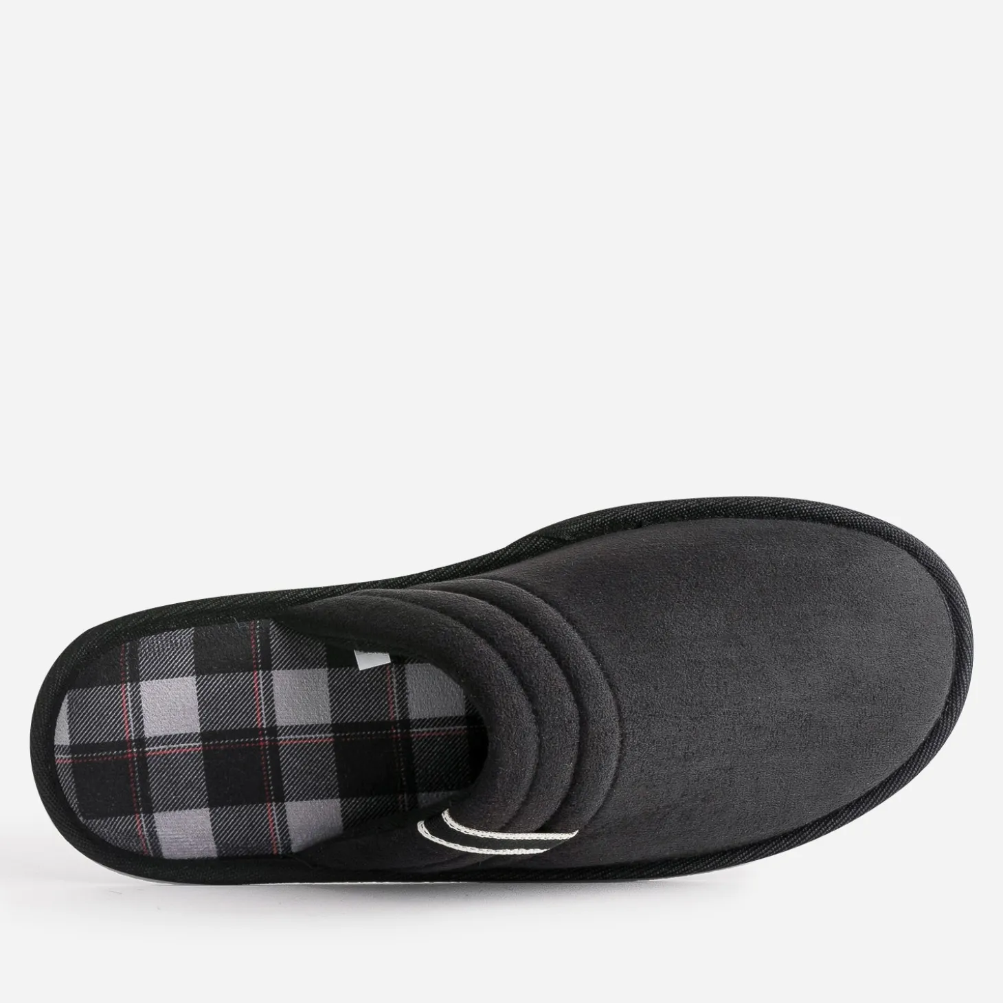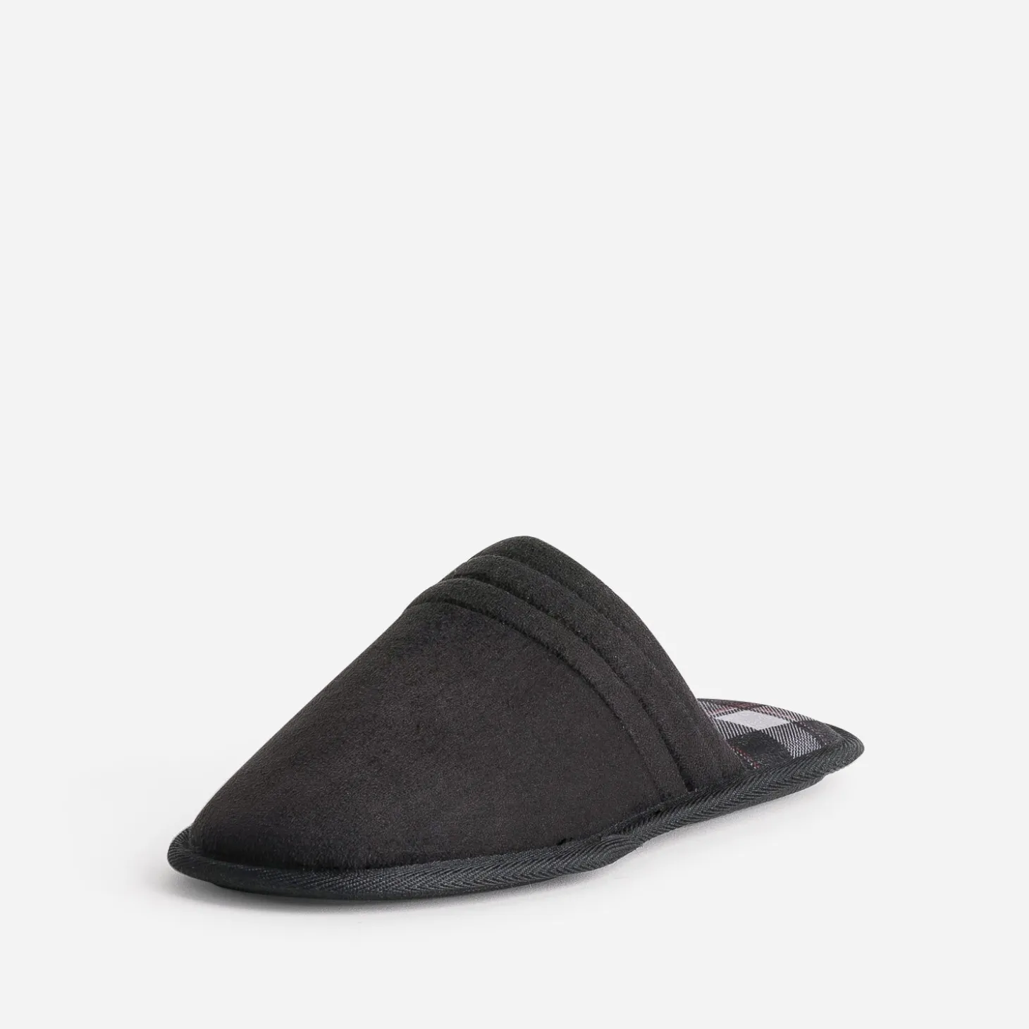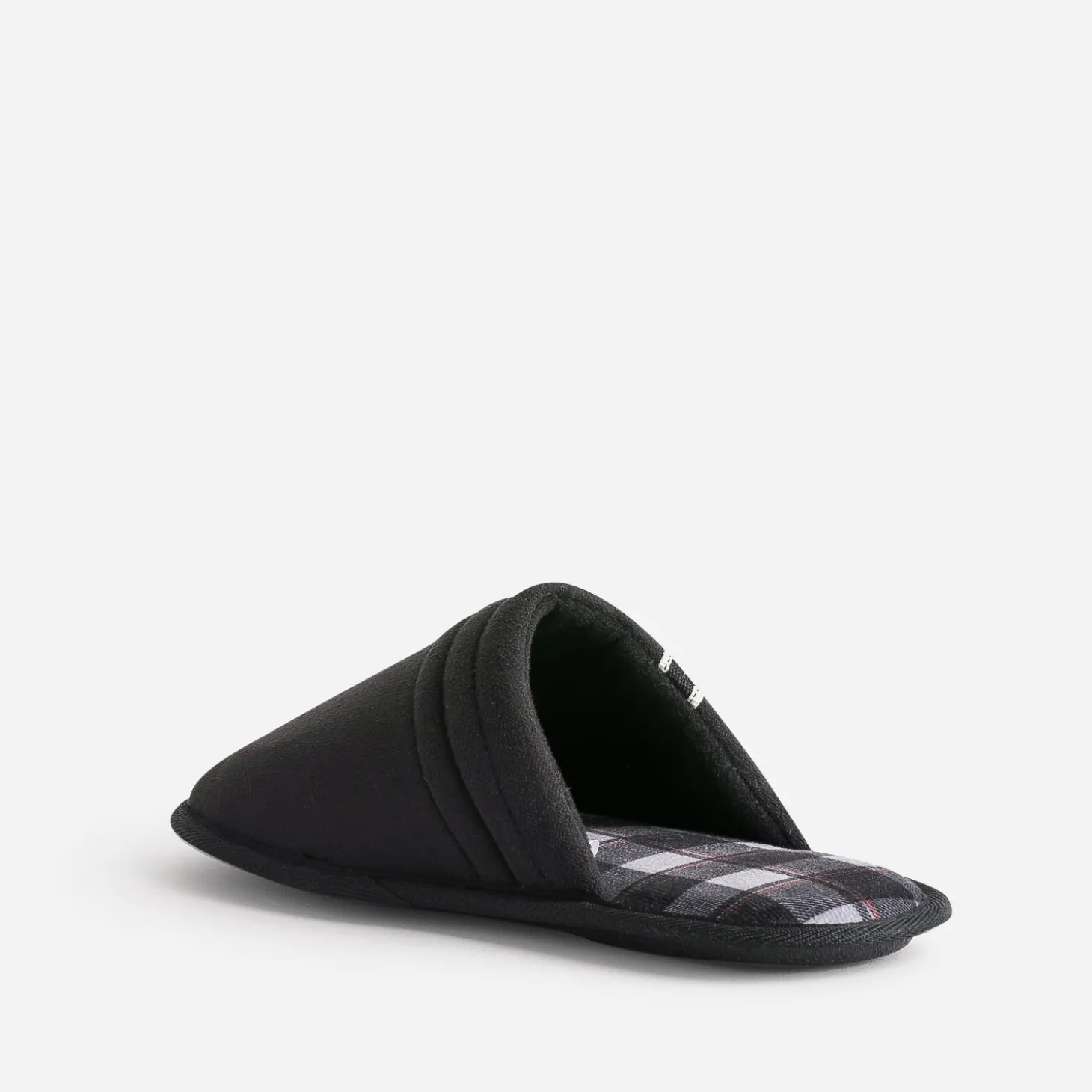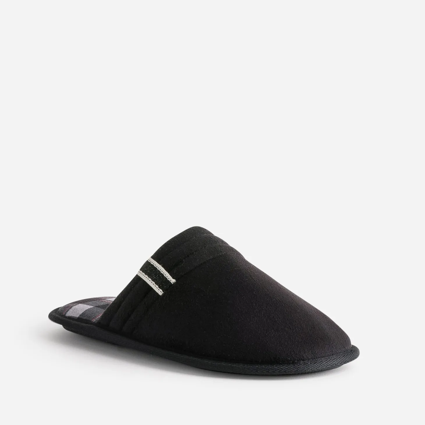 En textile noir, ce chausson pour homme opte pour une forme mule, très facile à enfiler et à ôter. La semelle première se démarque par un motif carreaux gris, noir, rouge, et le dessus est décoré d’une petite ganse rayée. Il ne vous reste plus qu’à y glisser vos pieds.