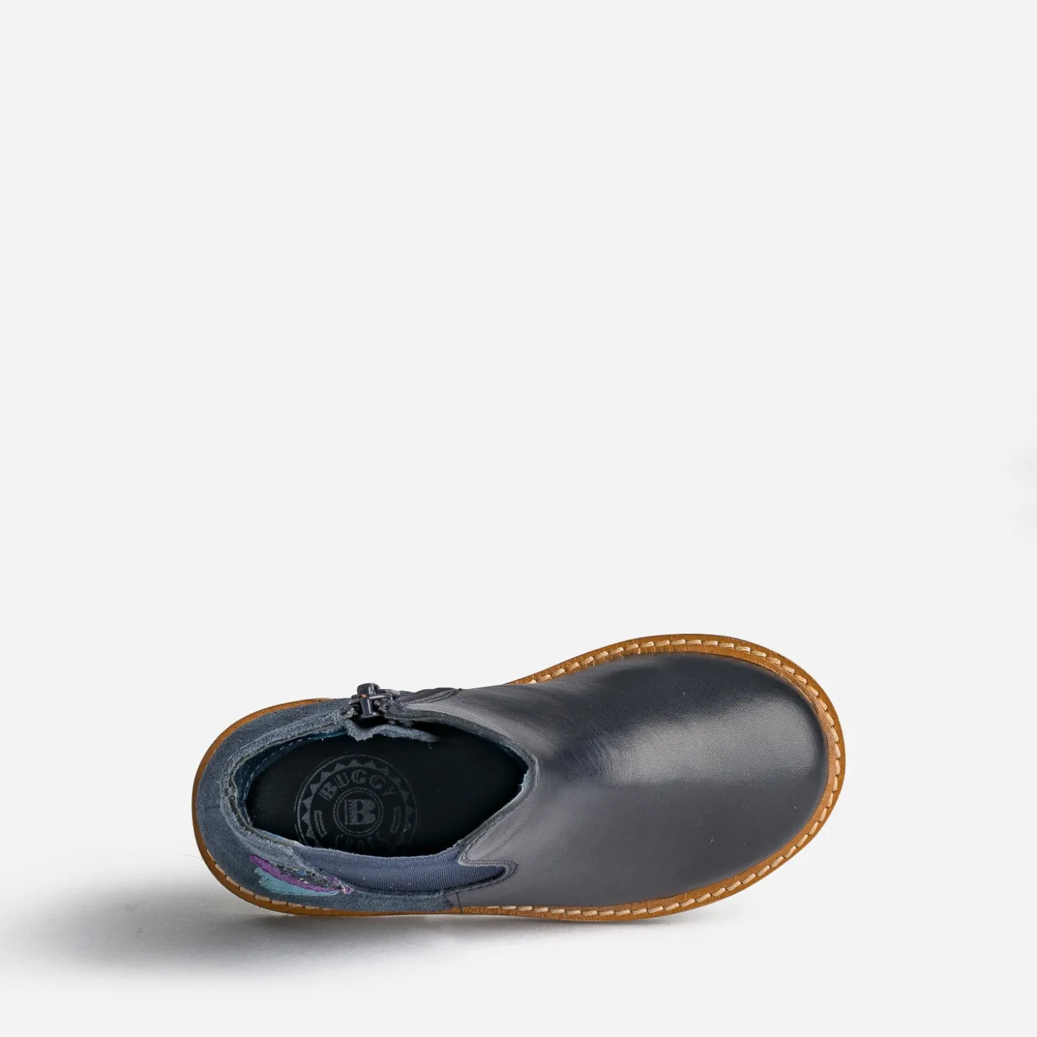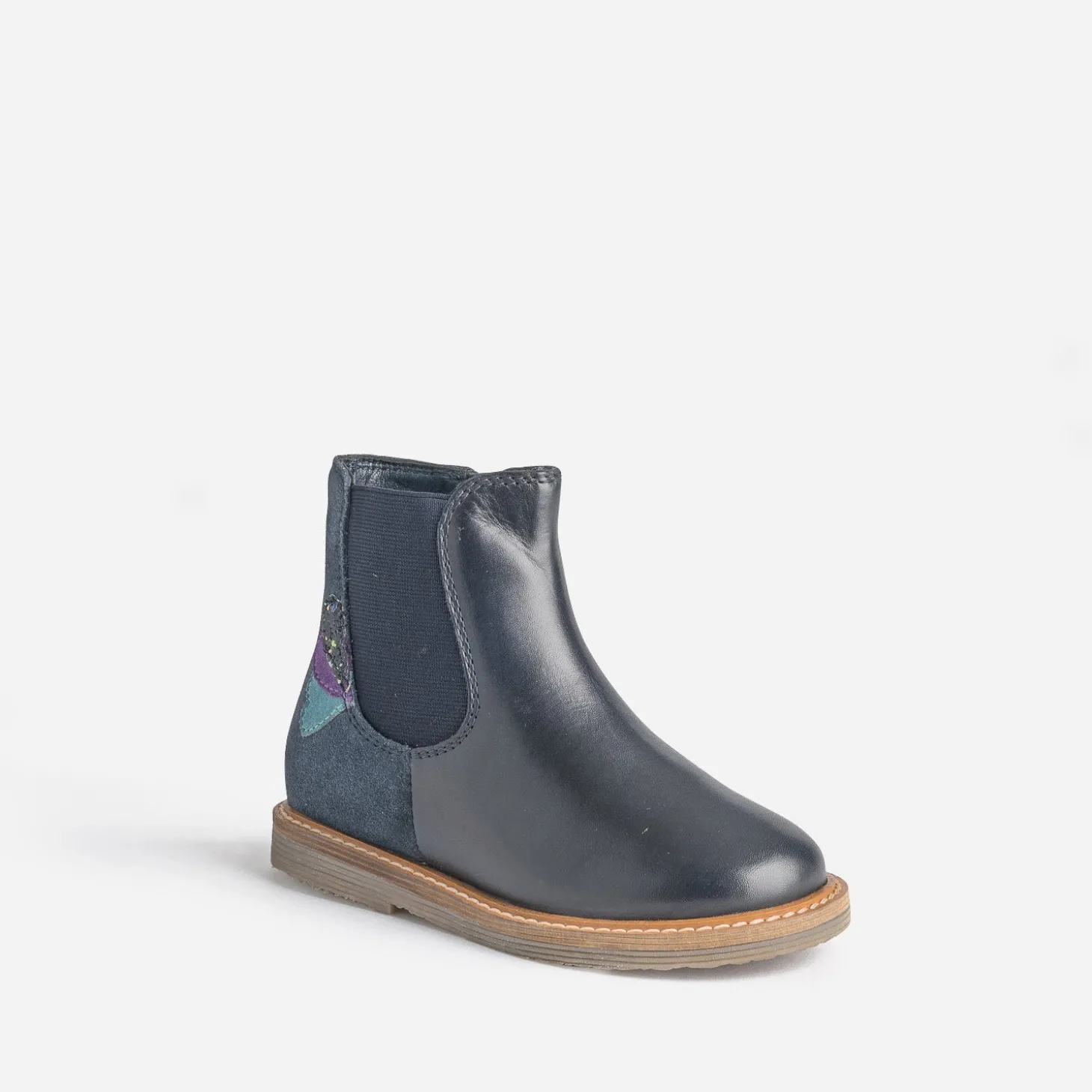 Coup de cœur pour ce Chelsea boots. Le cuir lisse et le cuir velours s’associent dans un coloris bleu marine, décoré de trois petits pétales colorés, dont un pailleté. Un modèle facile avec les jeans ou les robes de la saison.