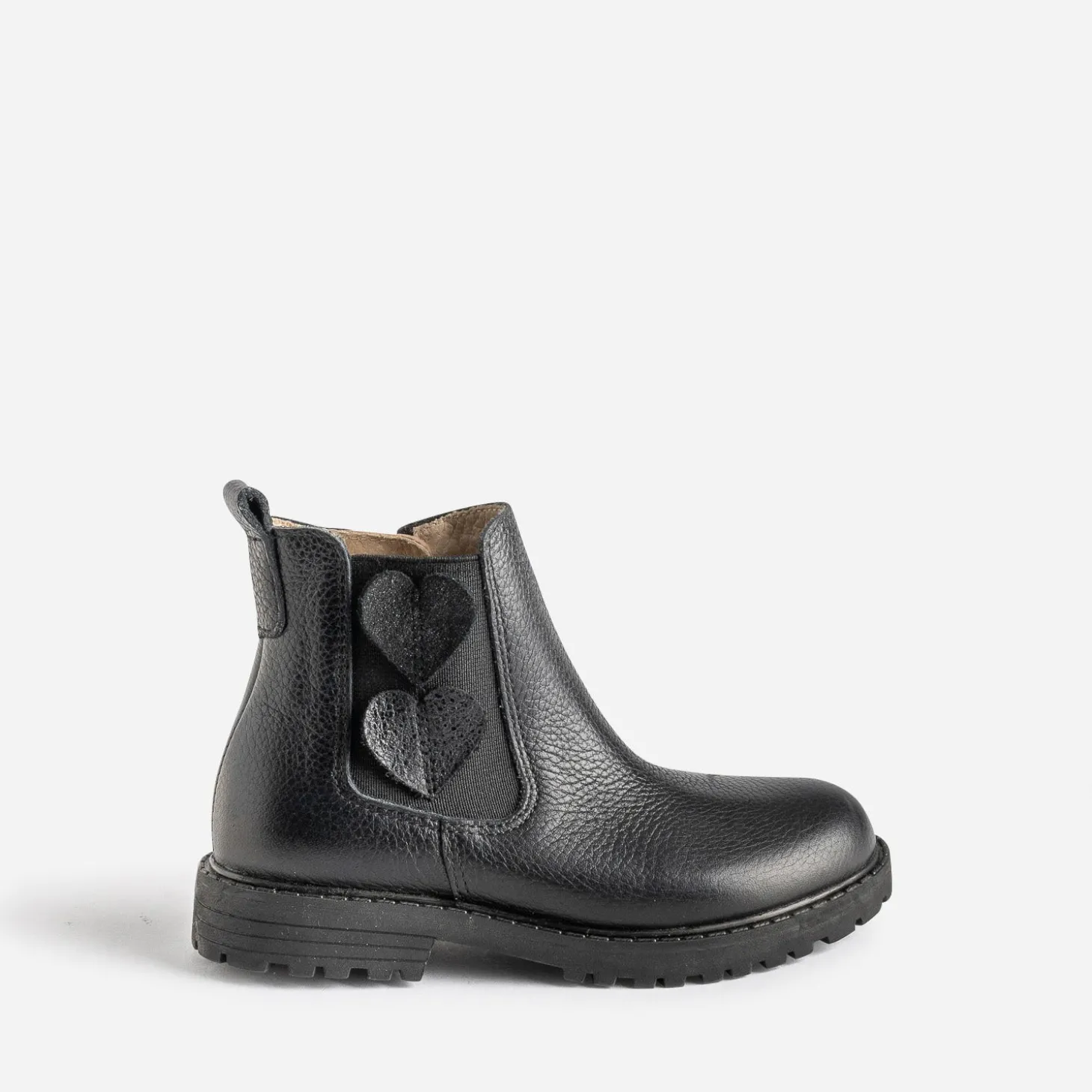 L’amour fou pour ce Chelsea boots fille. En cuir grainé noir, il se démarque par un décor de deux cœurs posés sur l’élastique latéral et une semelle crantée. Robe imprimée ou unie, short d’hiver ou jean slim, le look rock est vivement recommandé.