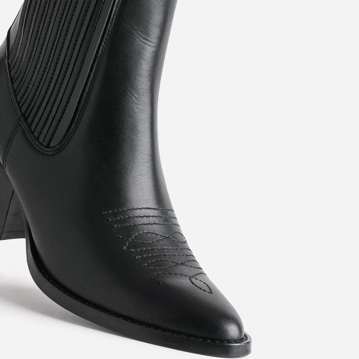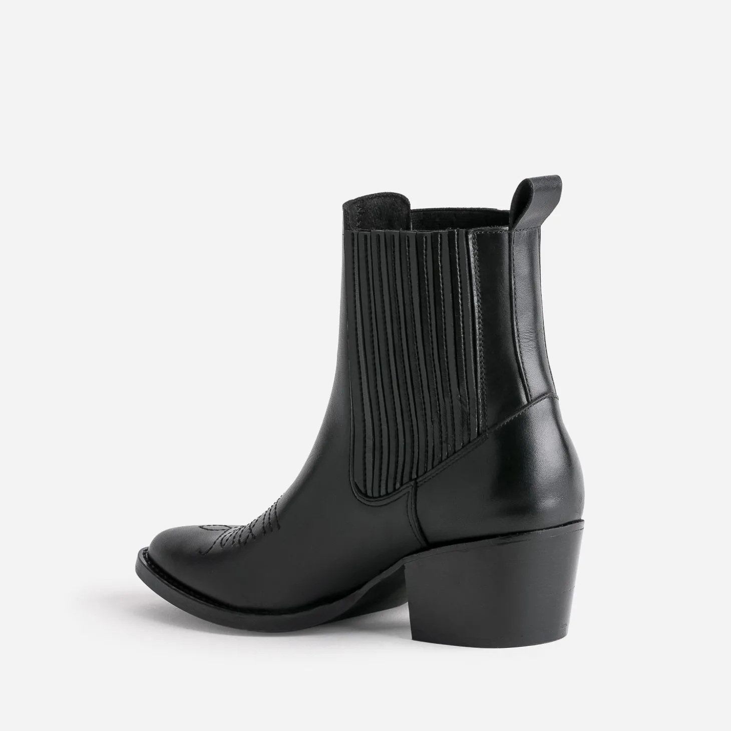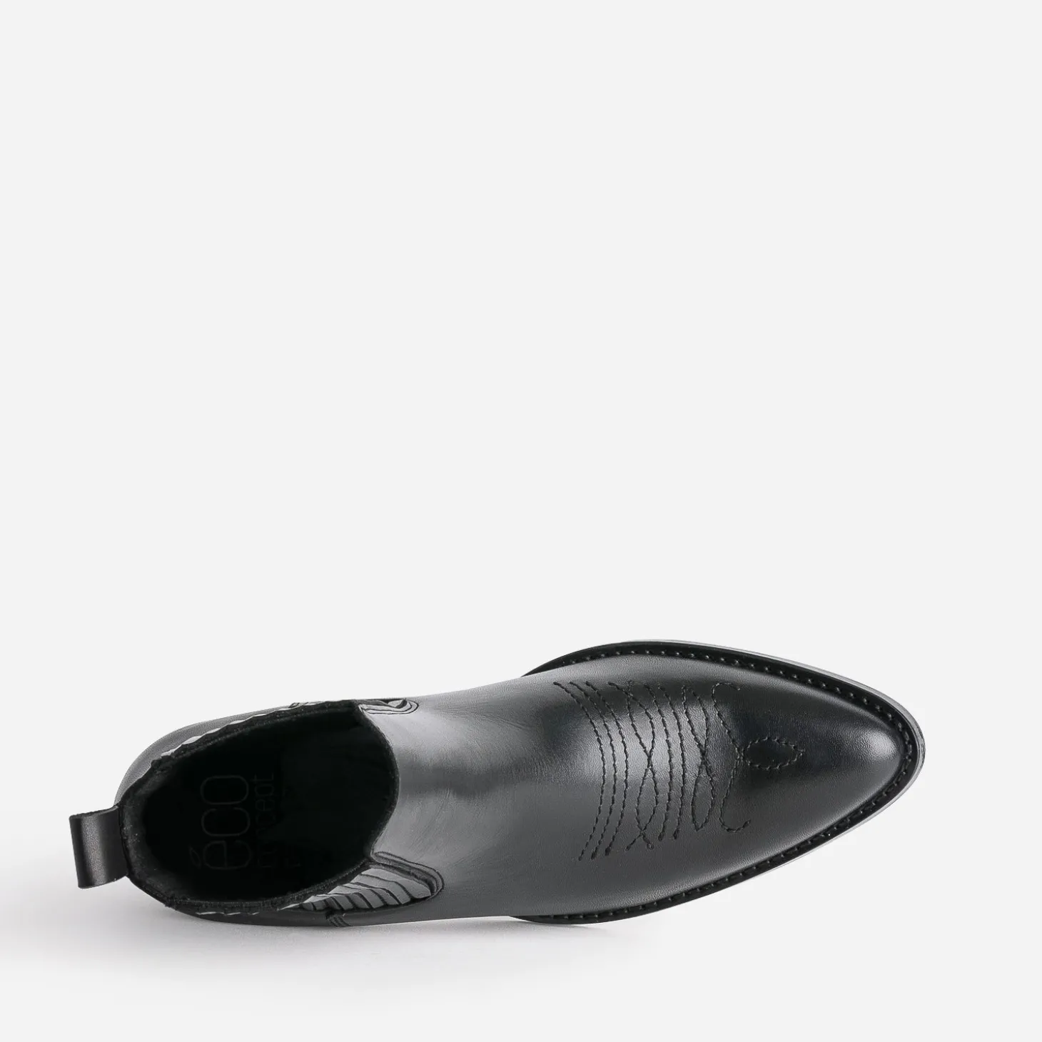 Bout pointu, talon biseauté, surpiqûres ton sur ton sur le dessus du pied et élastiques latéraux avec bandes de cuir cousues : pas de doute, ce Chelsea boots pour femme s’inspire des santiags et de l’allure western. En cuir noir, il s’accorde facilement avec une veste de costume noir et un jean enduit.