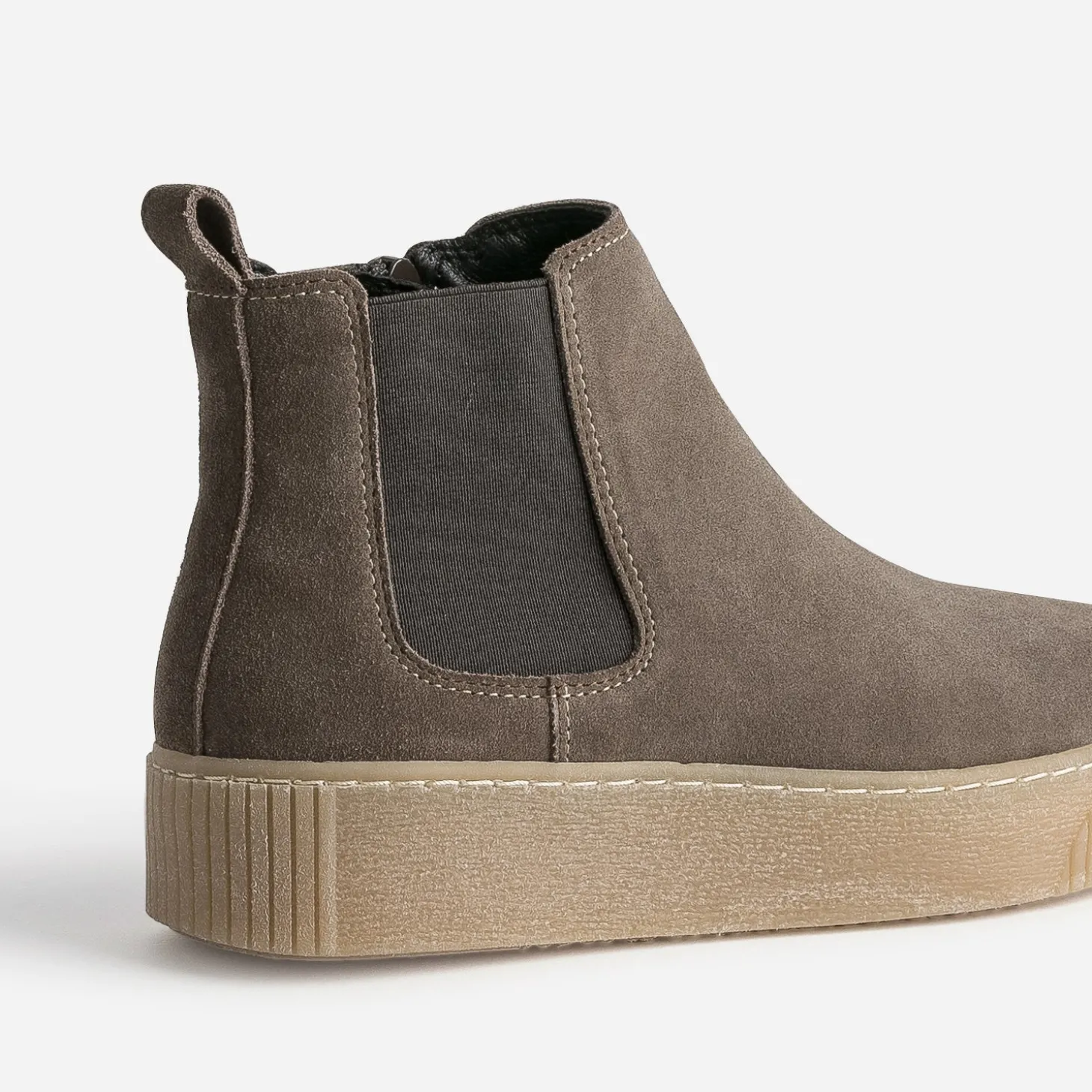 Le Chelsea boots revient en force cette saison. En cuir velours, il se décline en coloris taupe, entre le beige et le gris, et affirme son style par une semelle plateforme effet crêpe. Un modèle casual, à porter avec un pull beige chiné à col roulé, un jean écru et un manteau camel.
