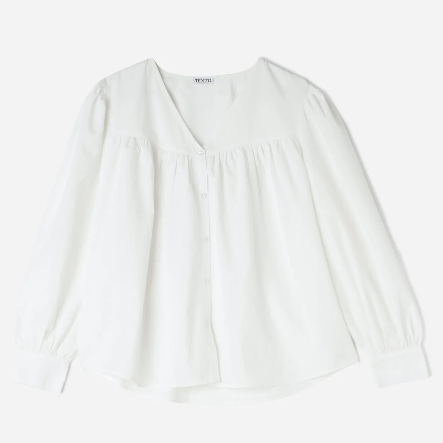 Forme droite, encolure V, manches longues boutonnées, petites fronces aux épaules, devant et manches, découpe poitrine, fermeture par boutons.