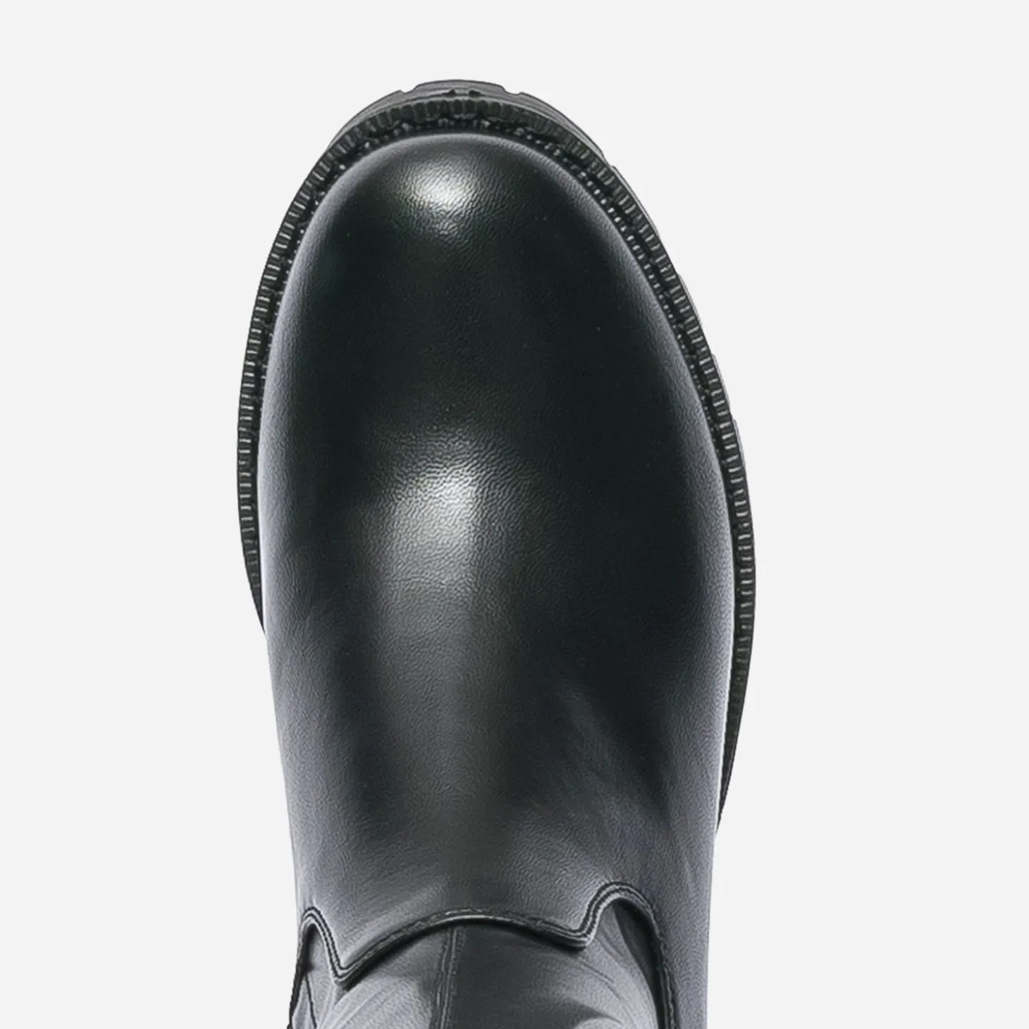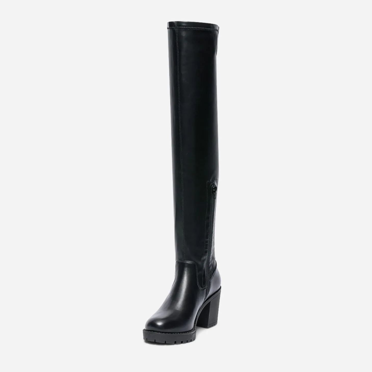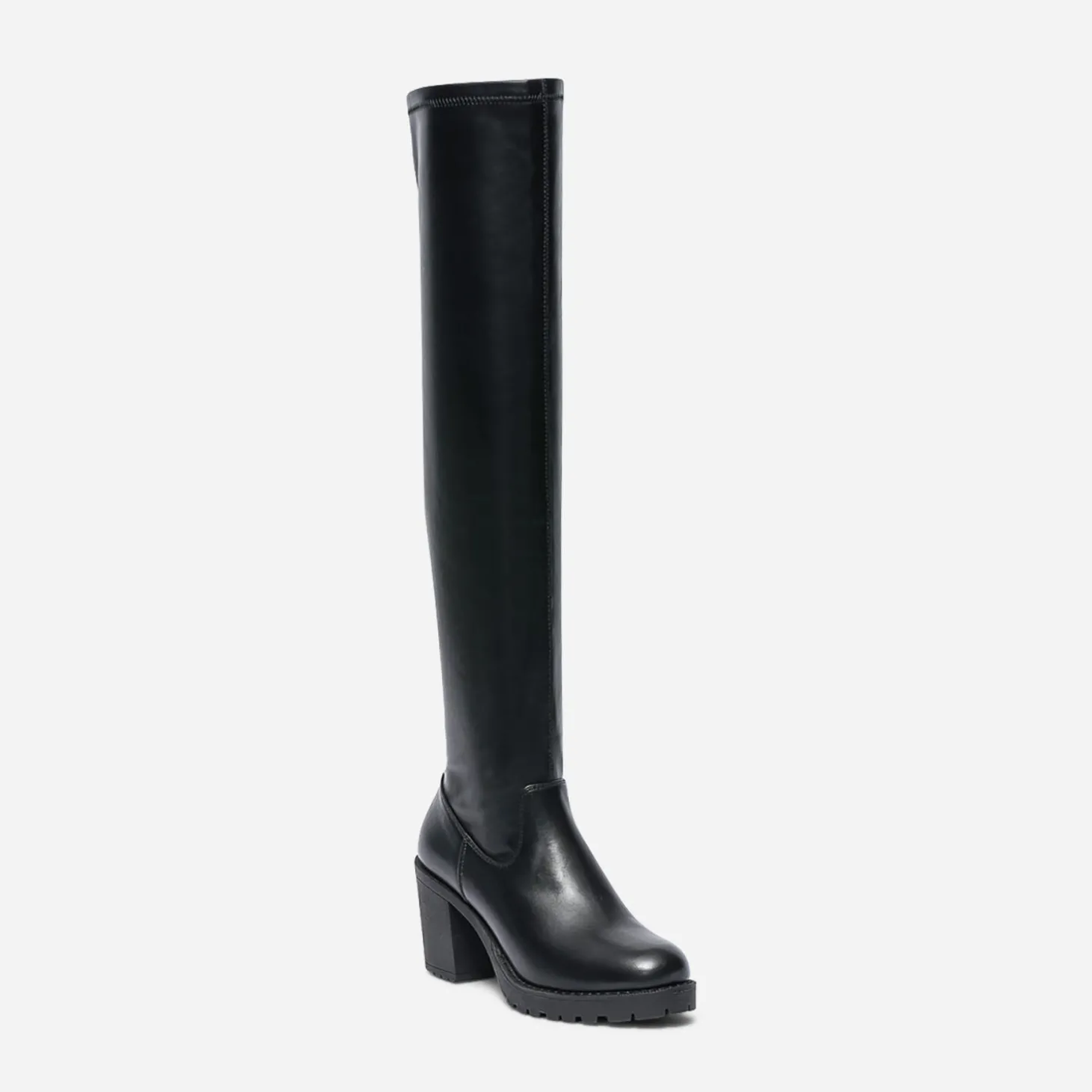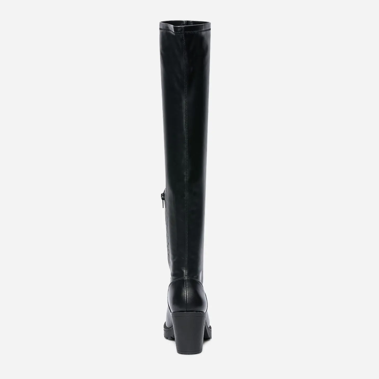 Esprit tout-terrain pour cette cuissarde femme. Montée sur une semelle et un talon large crantés, elle est pensée pour fouler le bitume urbain. Noire, elle est confectionnée en matière synthétique noire, fermée par un zip intérieur qui facilite l’entrée et la sortie du pied et maintient la tige sur le mollet. Un modèle à tester avec un look d’inspiration grunge, sur un leggings en simili et une sur-chemise à carreaux.